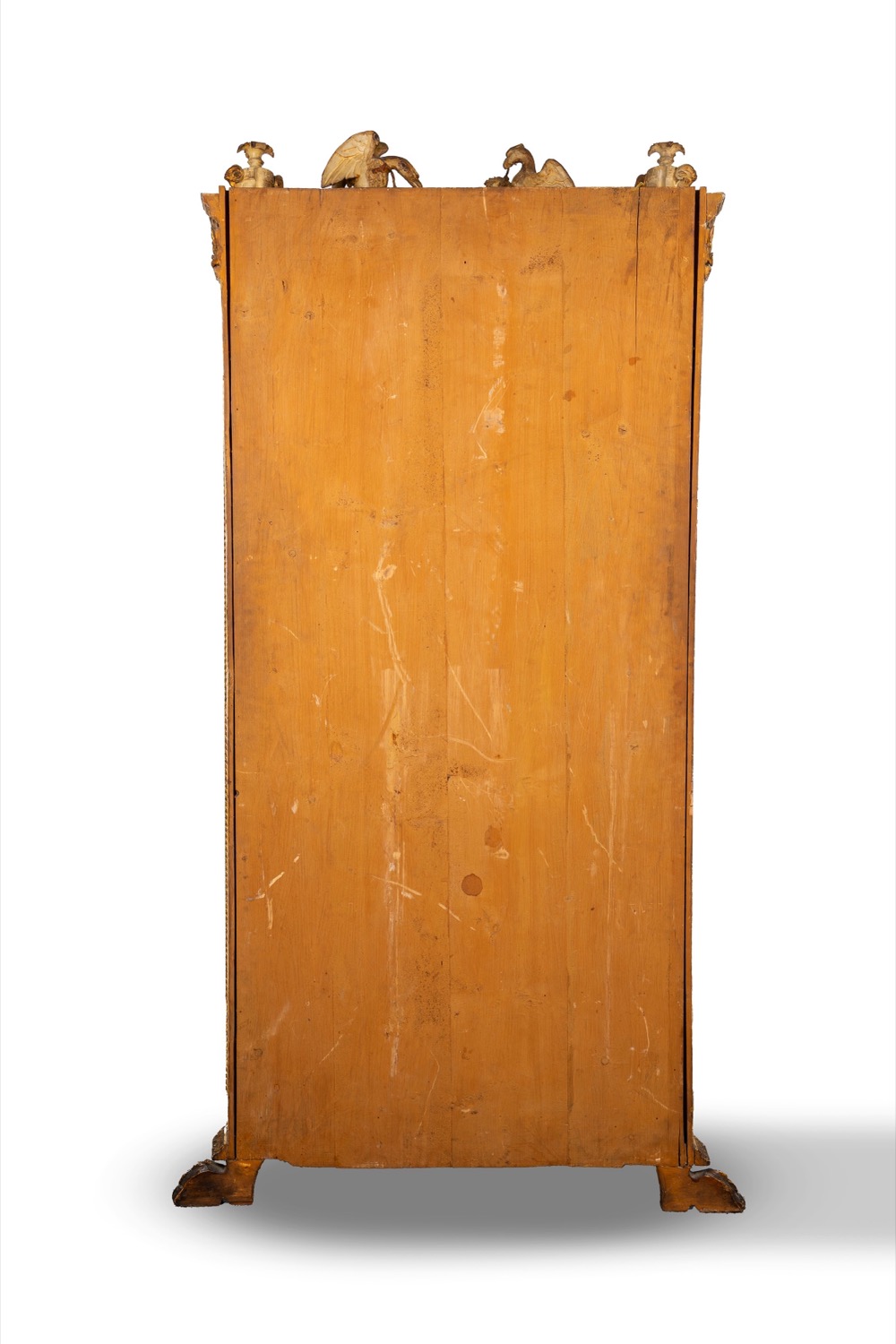decorata sulla sommità al centro con due aquile che reggono nel becco festone vegetale e agli angoli con due vasi con teste di ariete, fregio a girali centrato da mascherone sul bordo superiore, zampe ferine