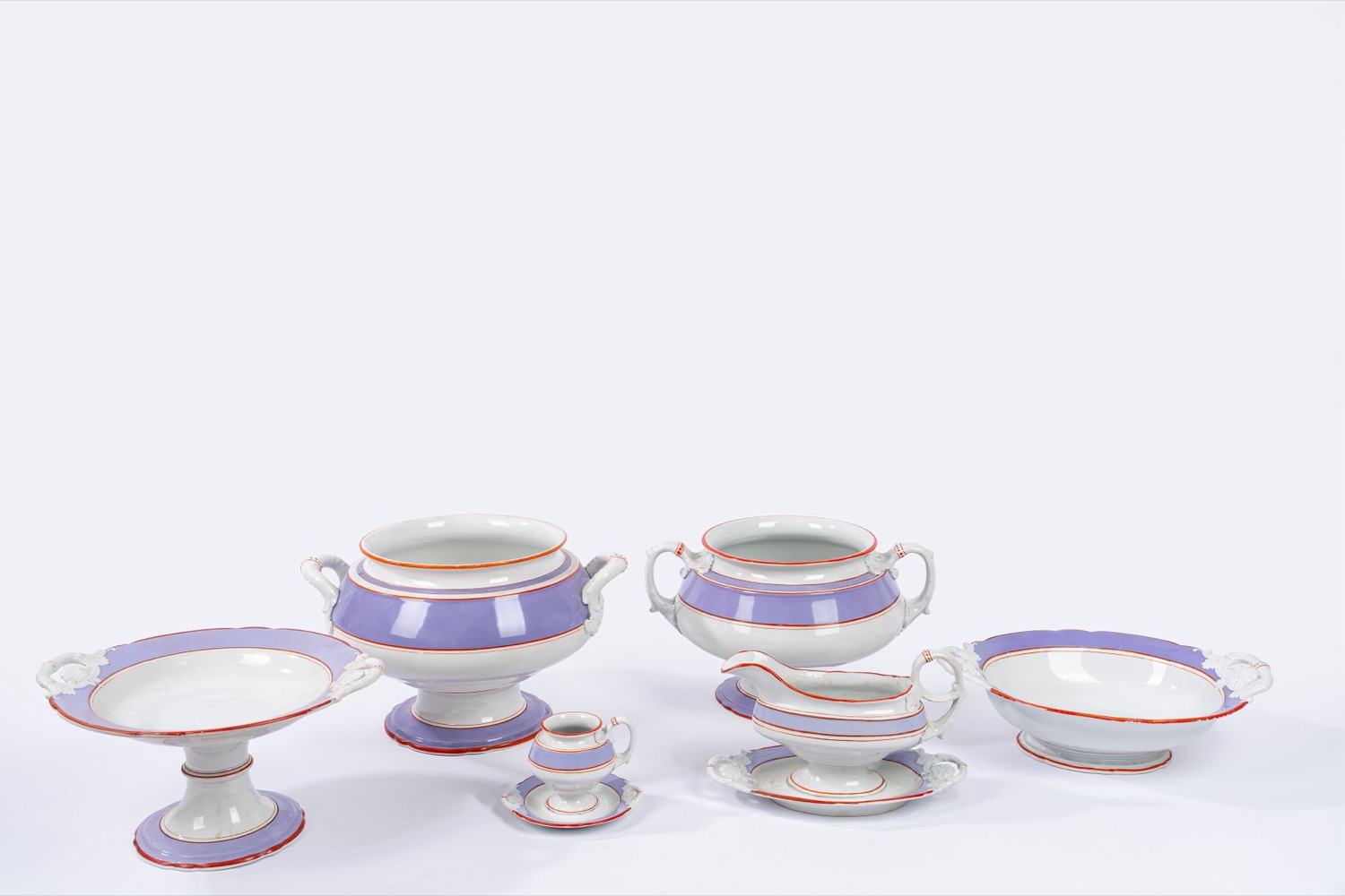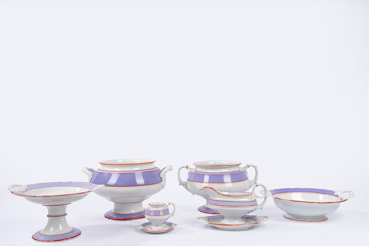 2 salsiere ovali cm 25 x 14in porcellana bianca con bordi lilla e rossi, marchio sotto la base