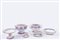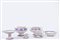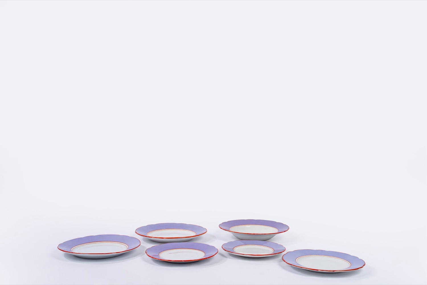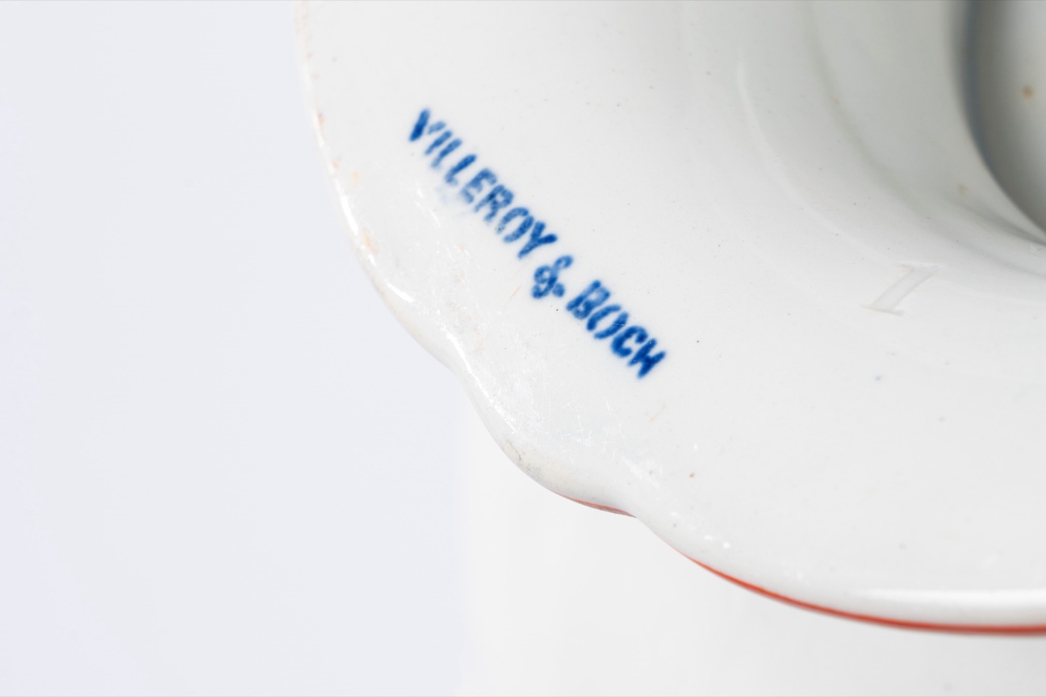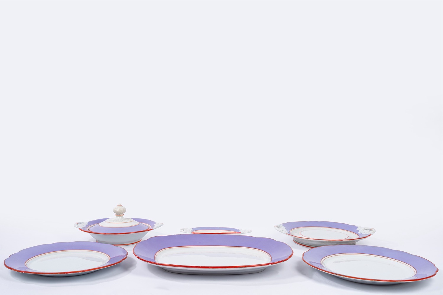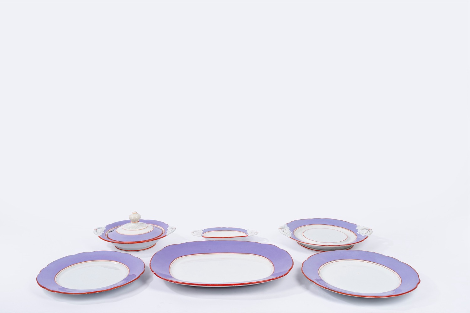 in porcellana bianca con bordi lilla e rossi, marchio sotto la base