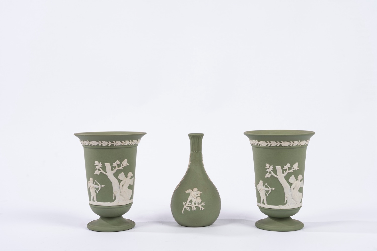 Lotto 224 | Lotto di tre vasi in biscuit verde, manifattura Wedgood