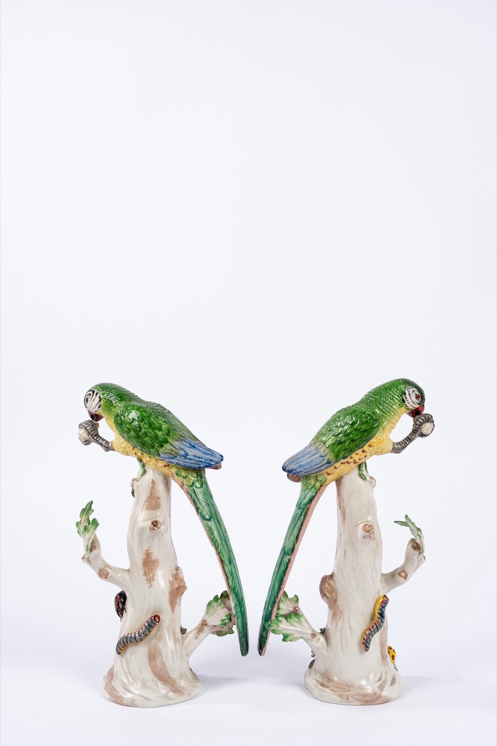 Coppia di pappagalli in porcellana policroma, manifattura Agostinelli Bassano