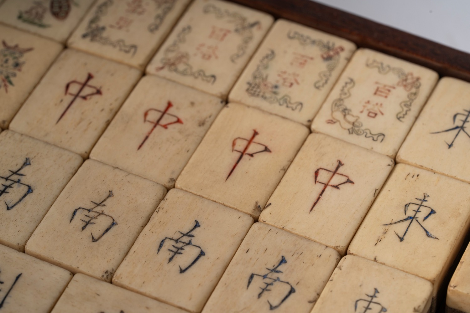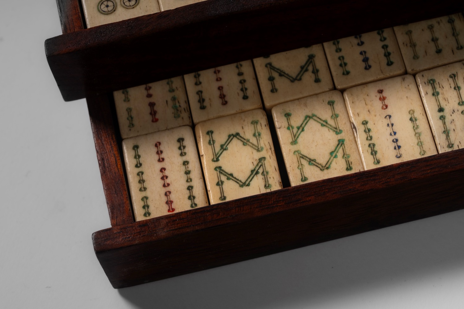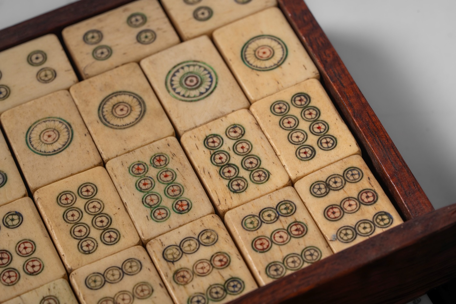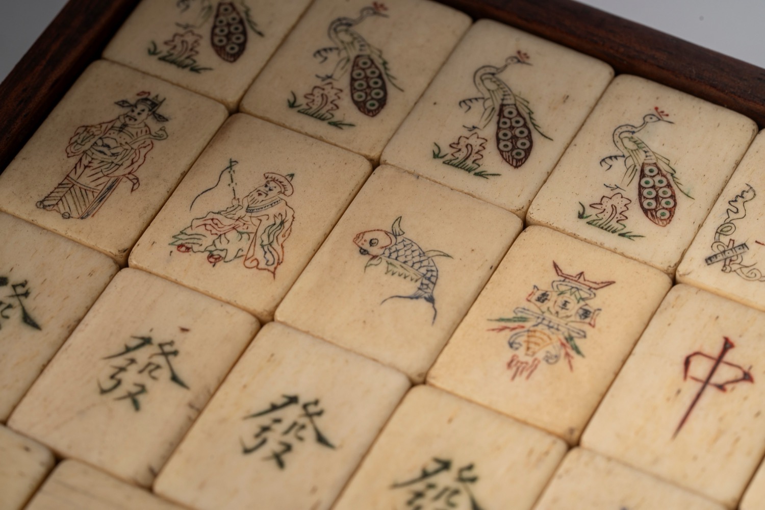 Gioco del Mahjong, tessere in bambù e osso, Cina, 1920-30; insieme a coppia di stampe a rotolo su carta a tema erotico