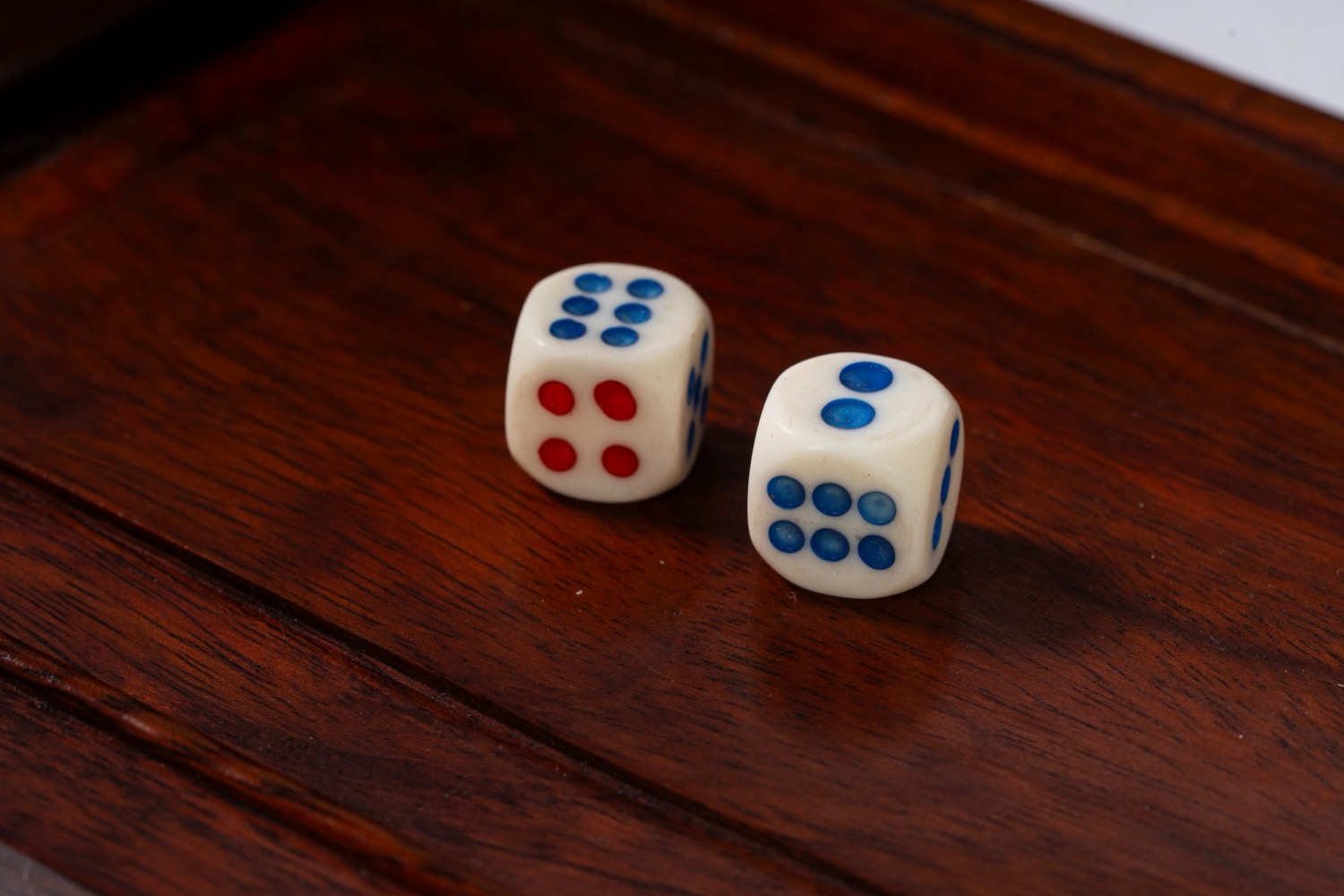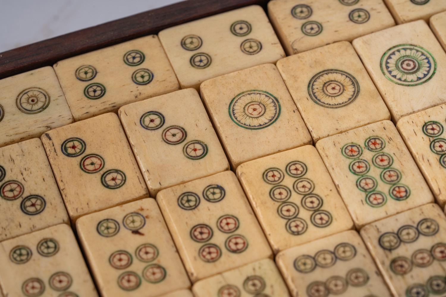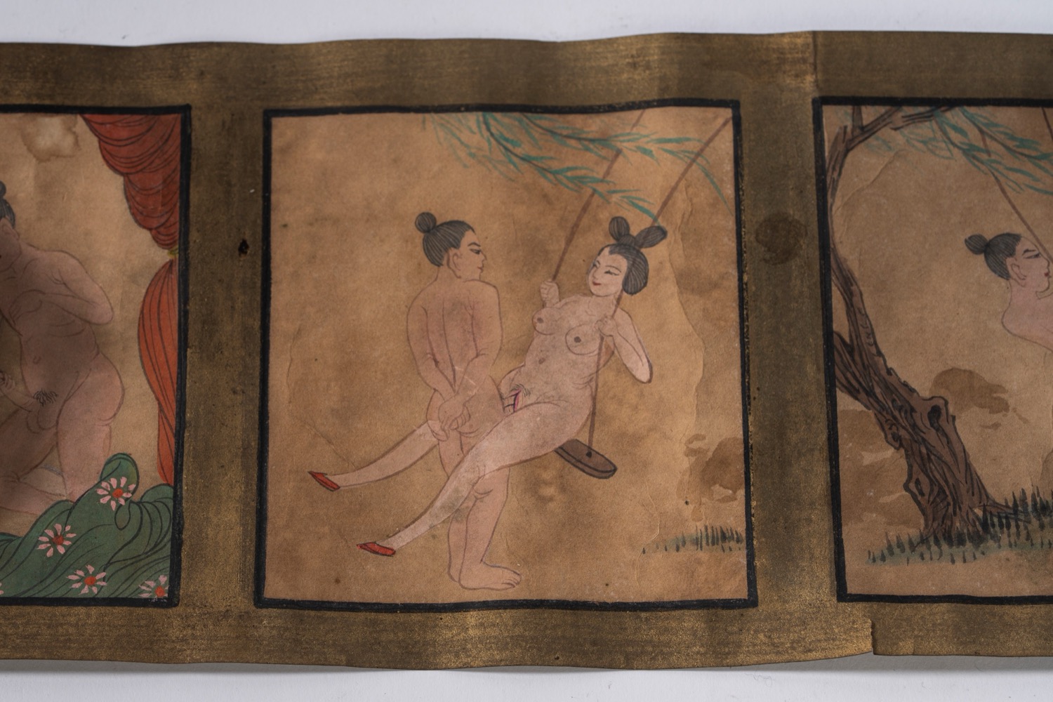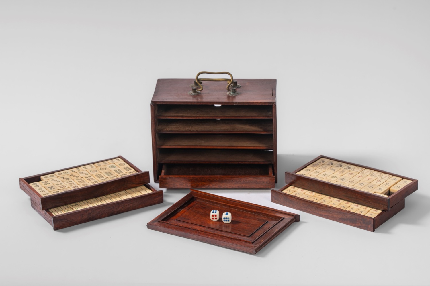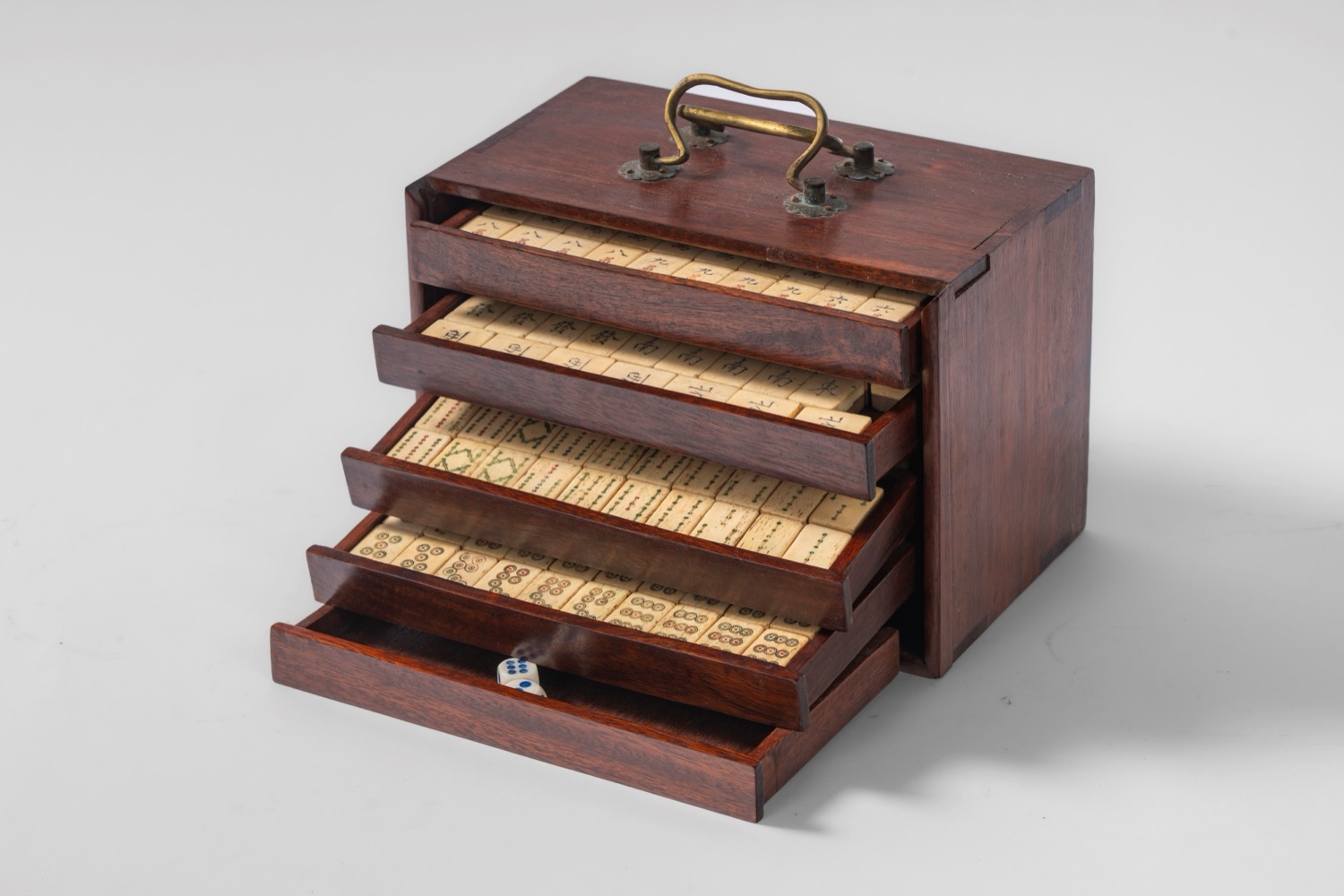 Gioco del Mahjong, tessere in bambù e osso, Cina, 1920-30; insieme a coppia di stampe a rotolo su carta a tema erotico
