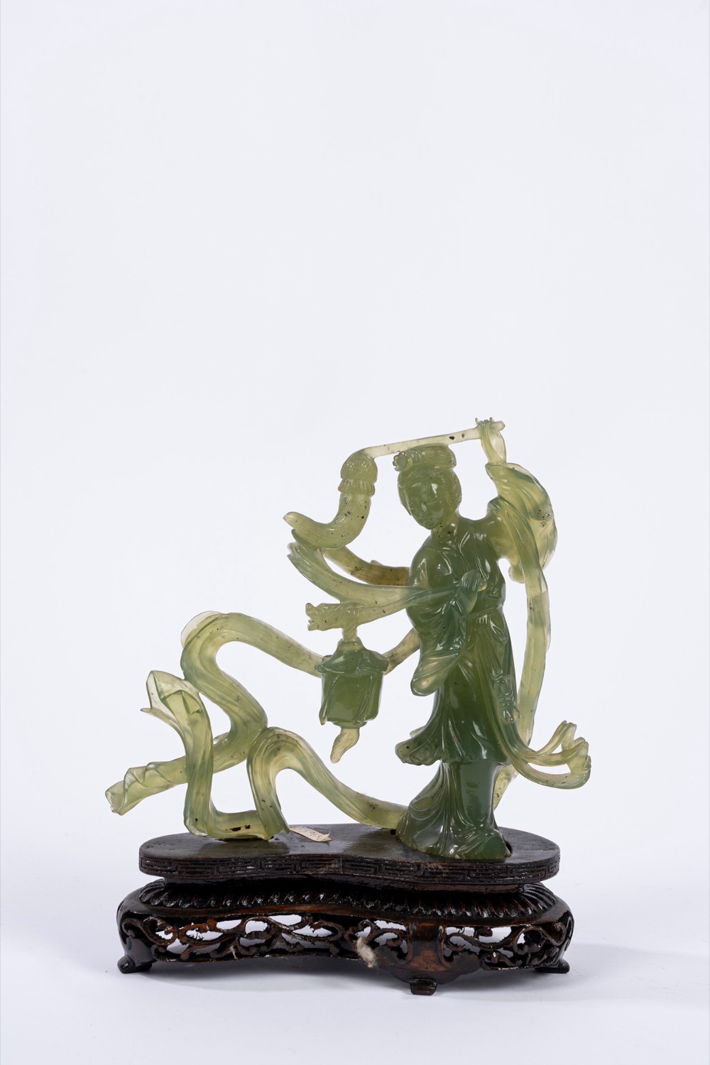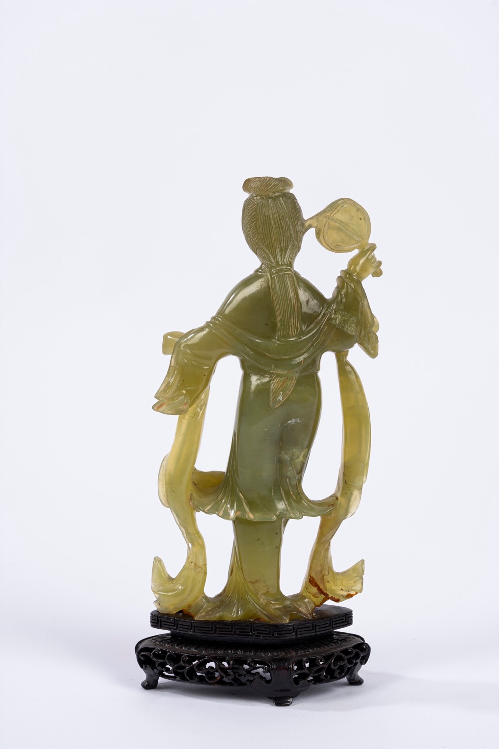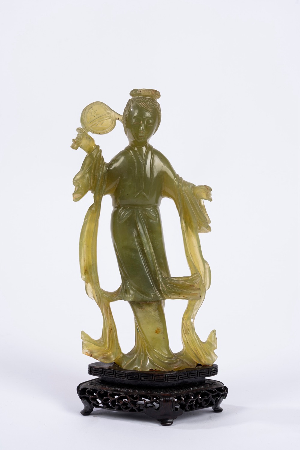 Lotto di tre Guanyn in pietra dura verde; Cina secolo XX