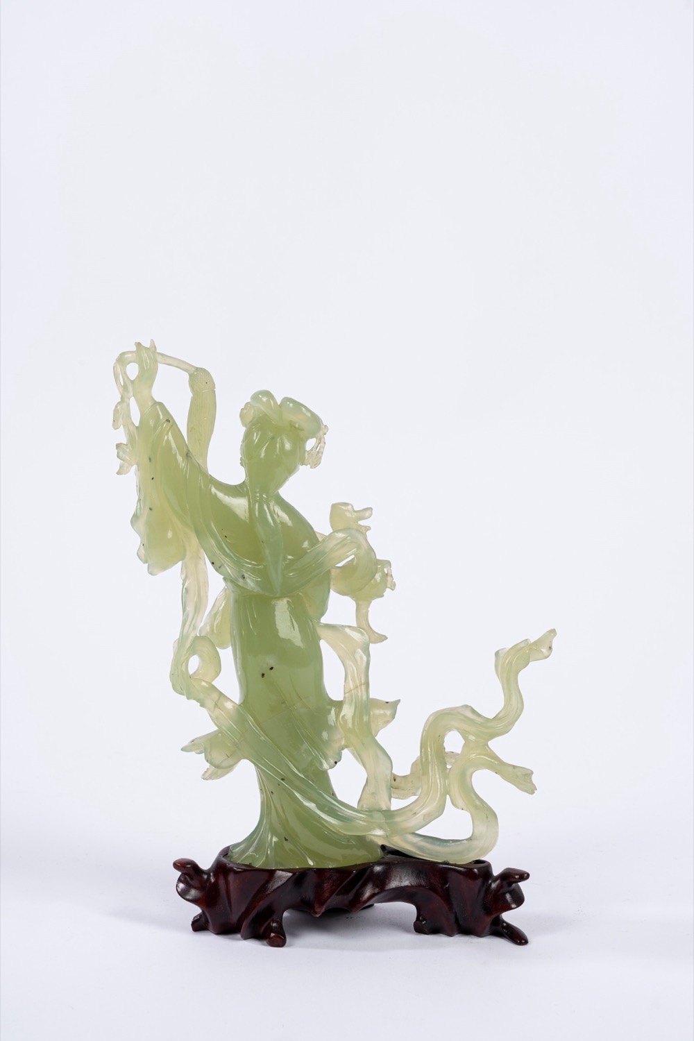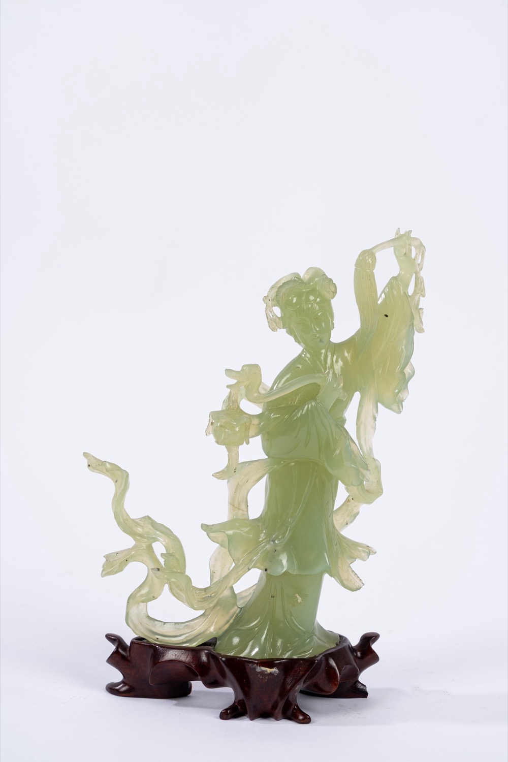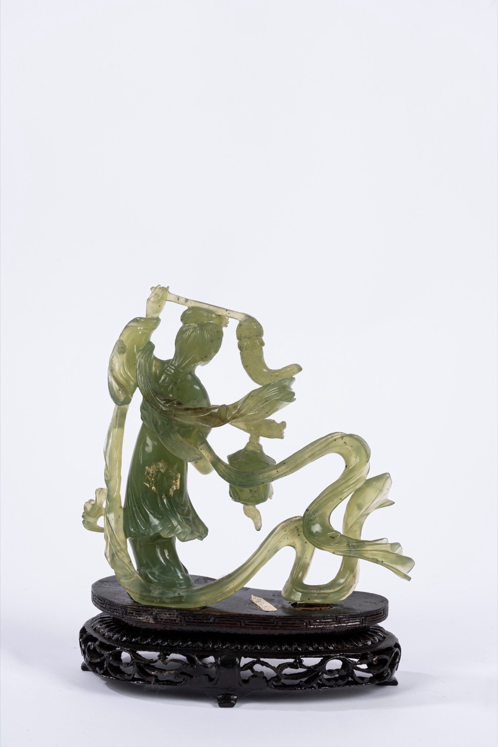 Lotto di tre Guanyn in pietra dura verde; Cina secolo XX