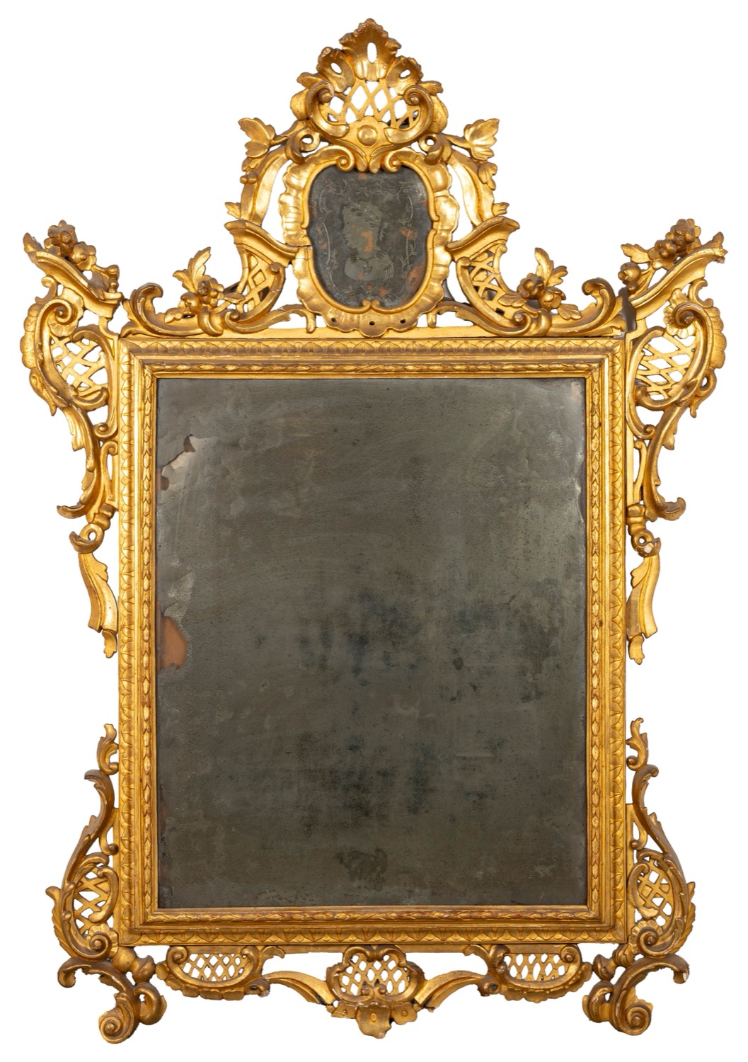 difetti e mancanzefastigio sulla sommità con specchio decorato da silhouette con profilo classico, decorata con motivi a traforo, cornucopie e motivi floreali