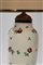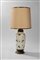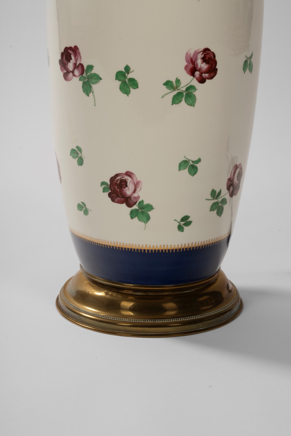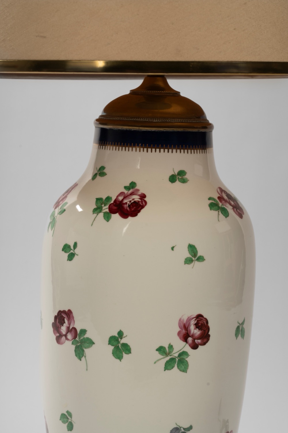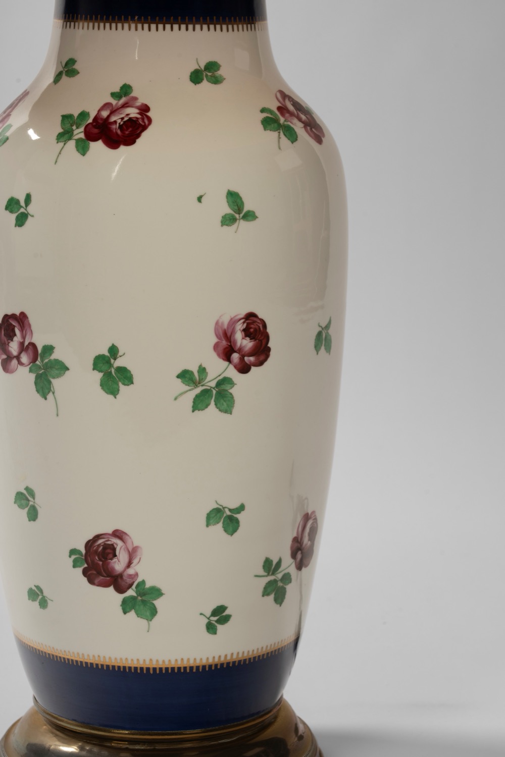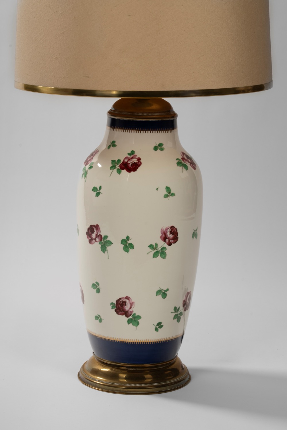 Con paralume. decorato a rose con foglie sparse su tutta la superficie, profili in blu cobalto con dorature.
