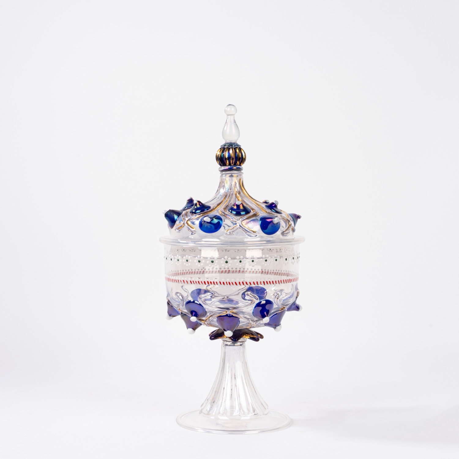 in vetro trasparente, decorata con motivi a bugnato blu e oroin vetro trasparente, decorata con motivi a bugnato blu e oro
