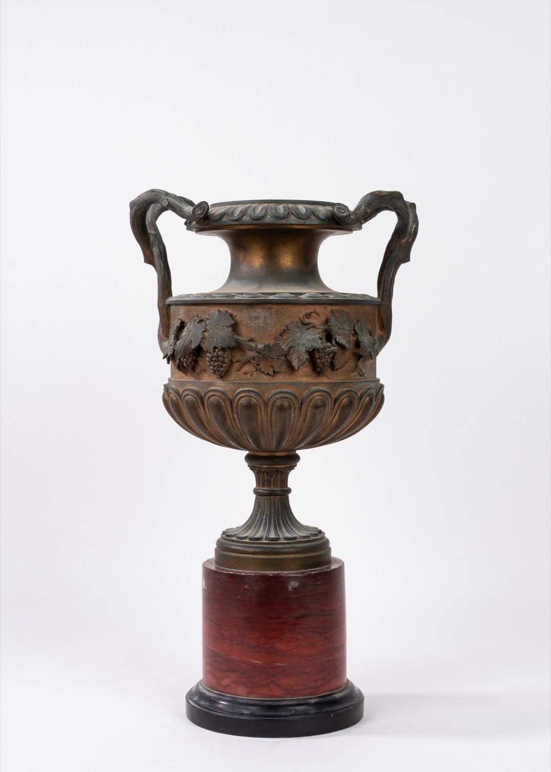 Vaso in bronzo, biansato e decorato con tralci d'uva