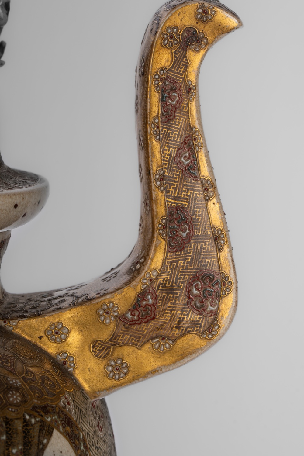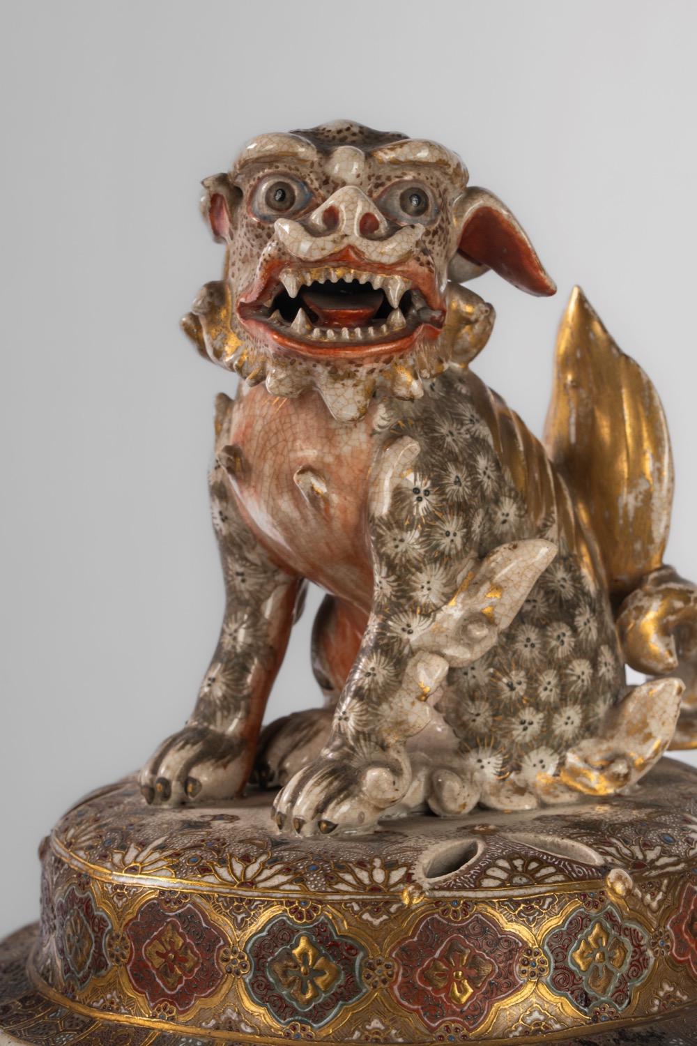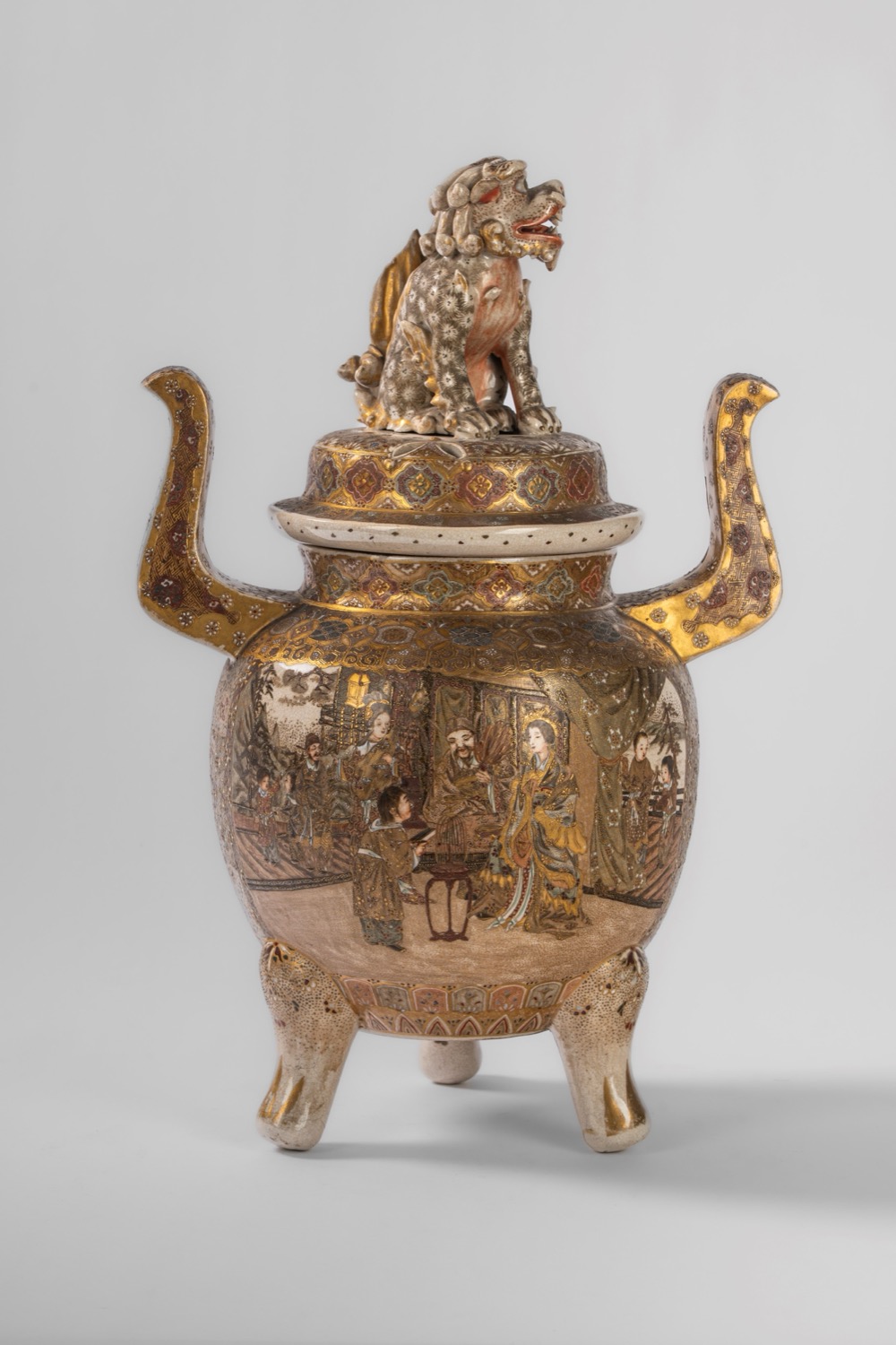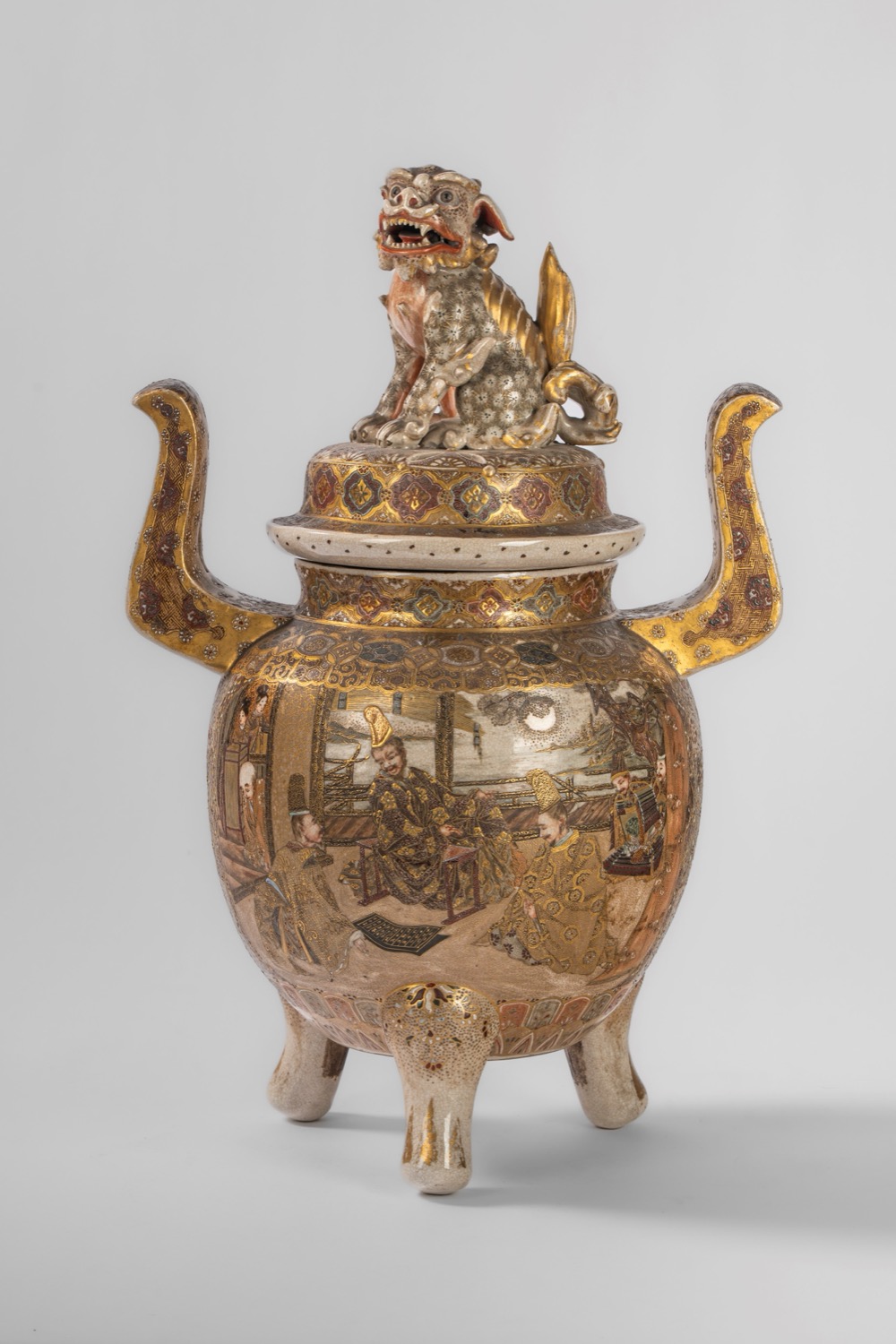 Grande incensiere in ceramica Satsuma; dipinto con scene di corte entro pannelli, il coperchio con un cane shishi, Giappone, epoca Meiji