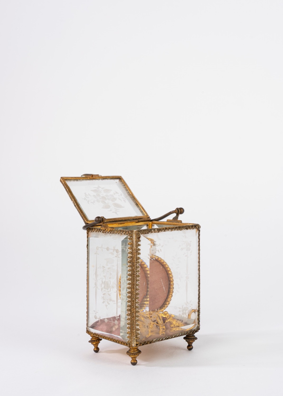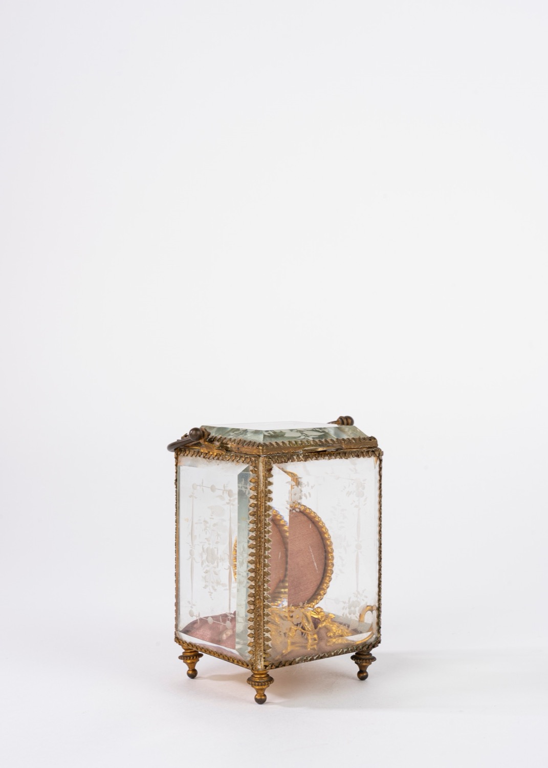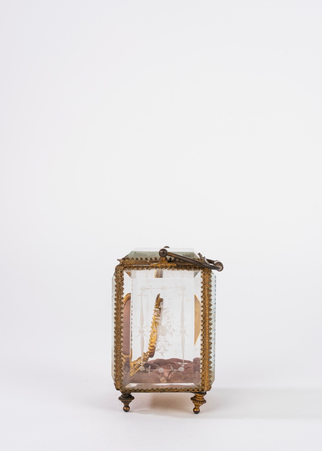 Porta orologio in bronzo dorato entro teca in cristallo molato, secolo XIX