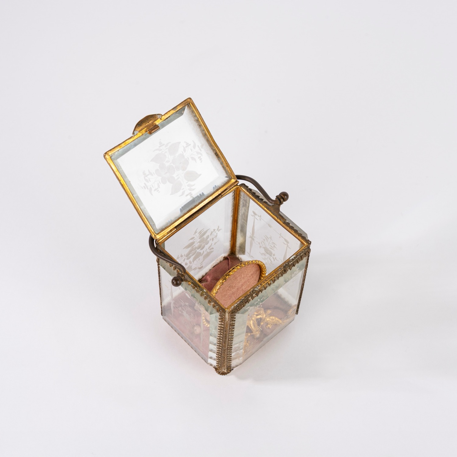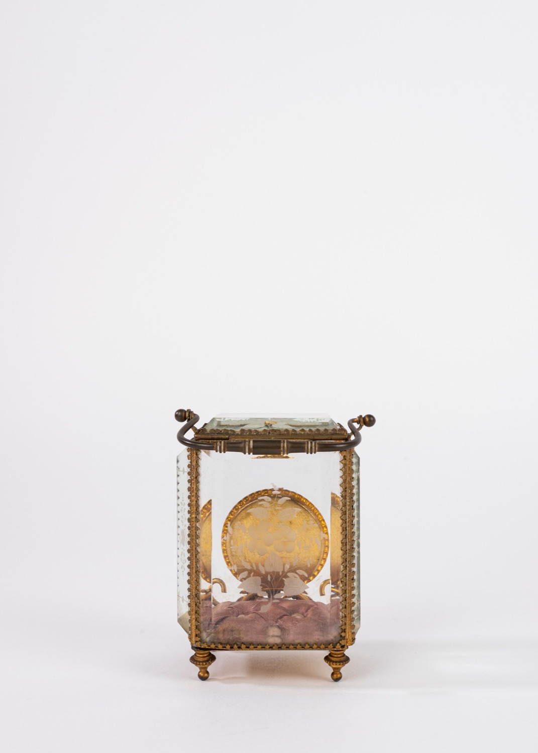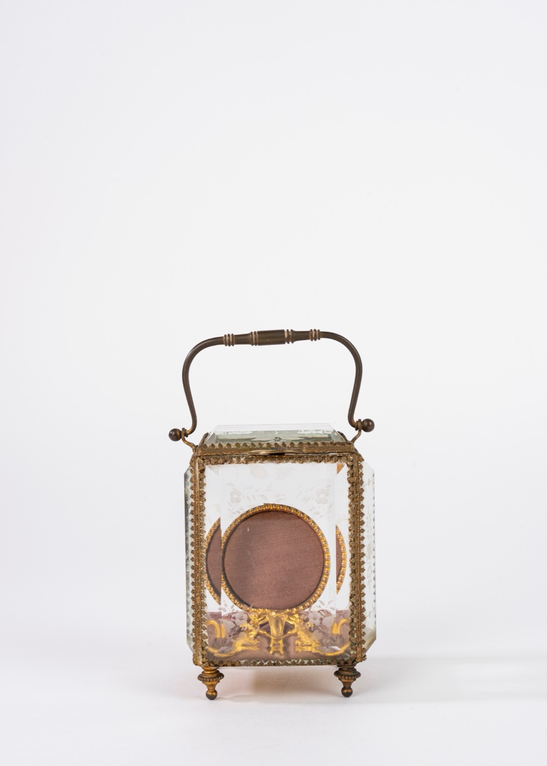 Porta orologio in bronzo dorato entro teca in cristallo molato, secolo XIX