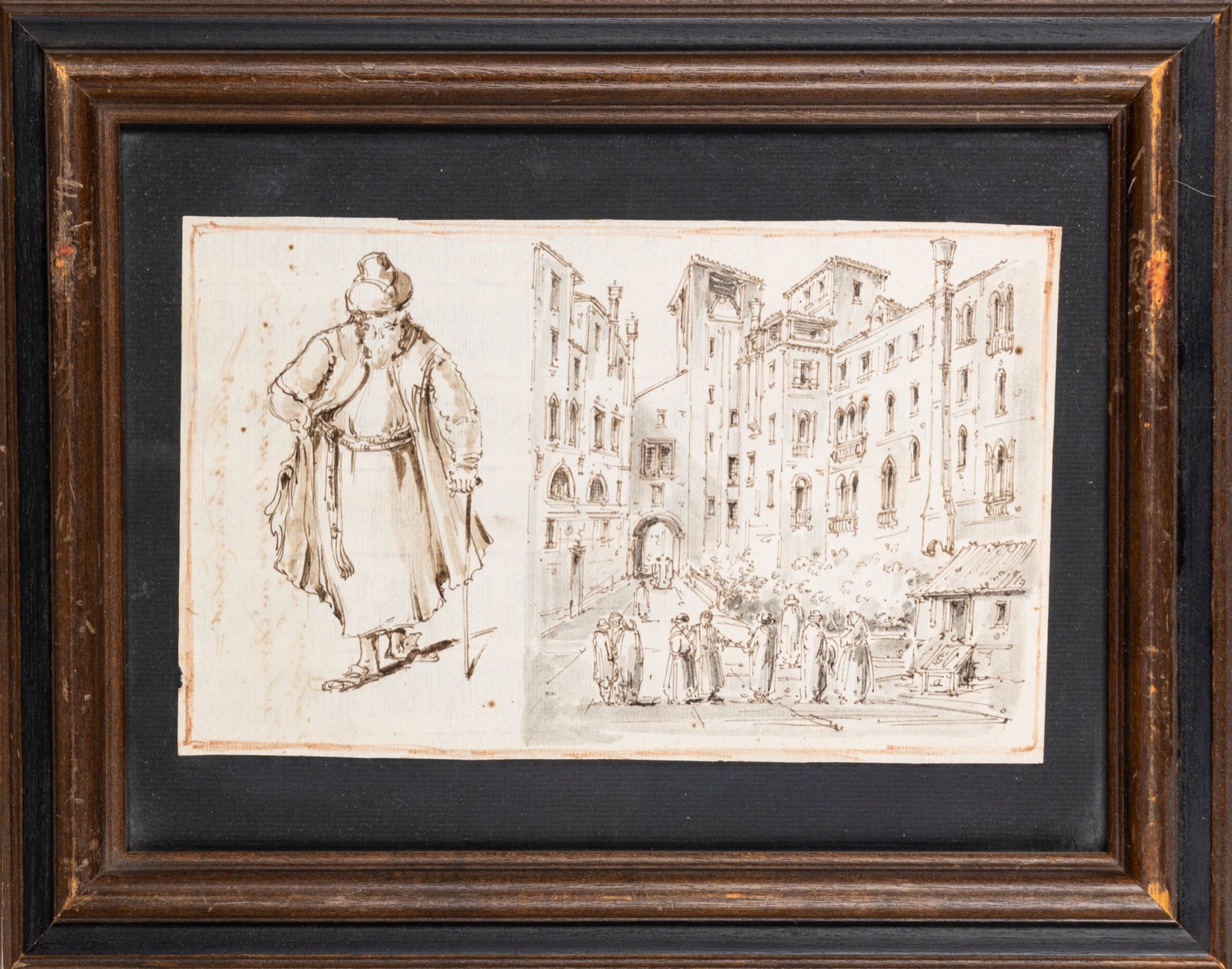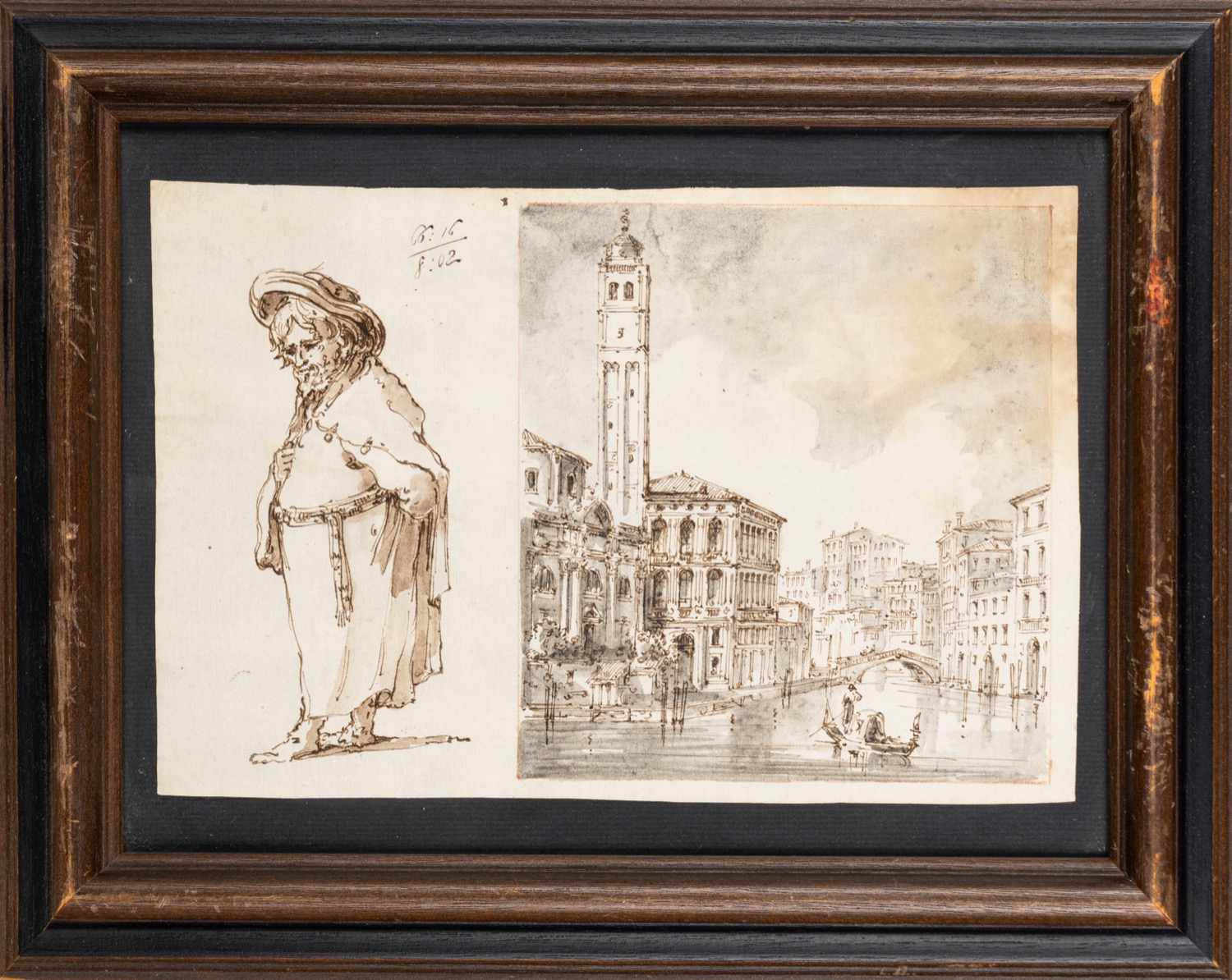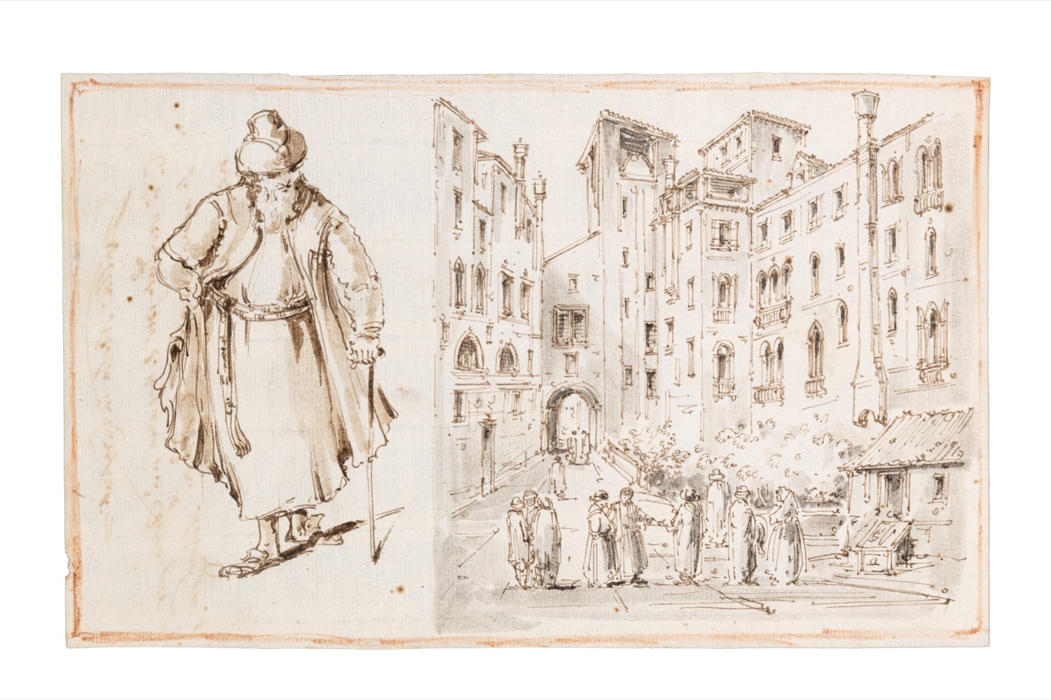 Maestro del Ricciolo, identificato con Giuseppe Latini (1903-1972) - Due disegni con vedute di Venezia e studi di personaggi