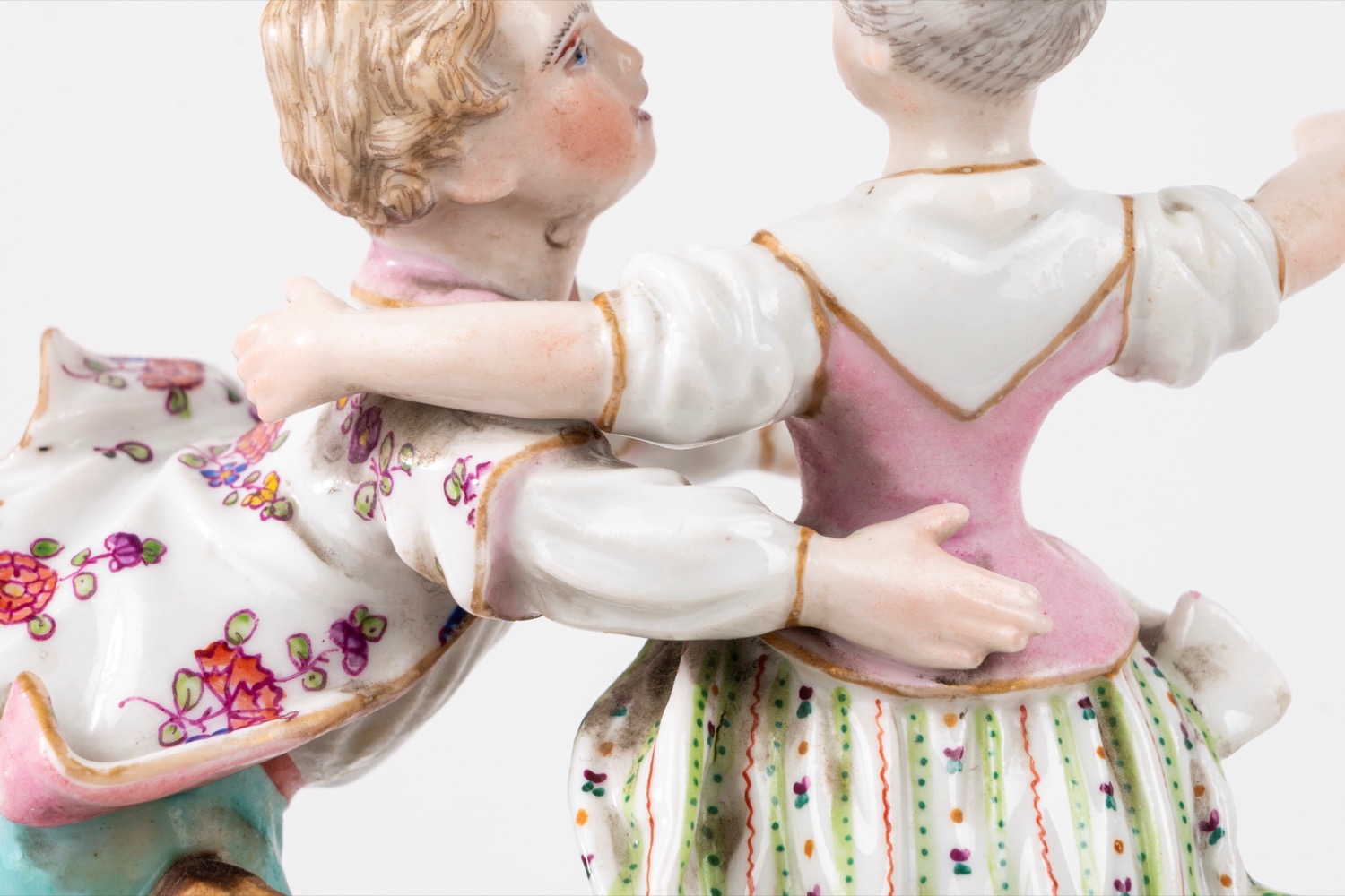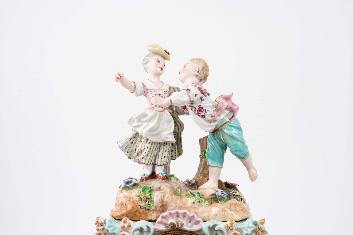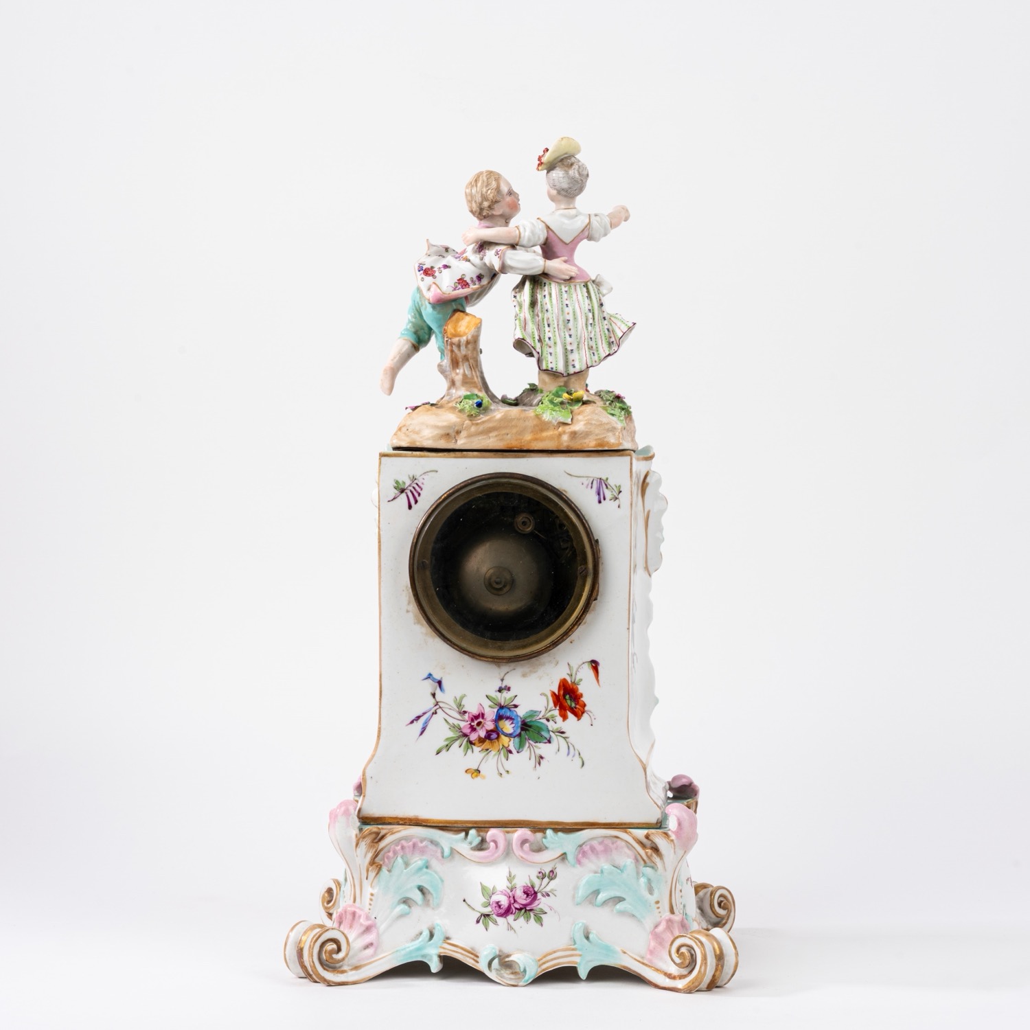 da revisionarecon coppia danzante sulla sommità e festone di fiori attorno al quadrante, base in porcellana policroma