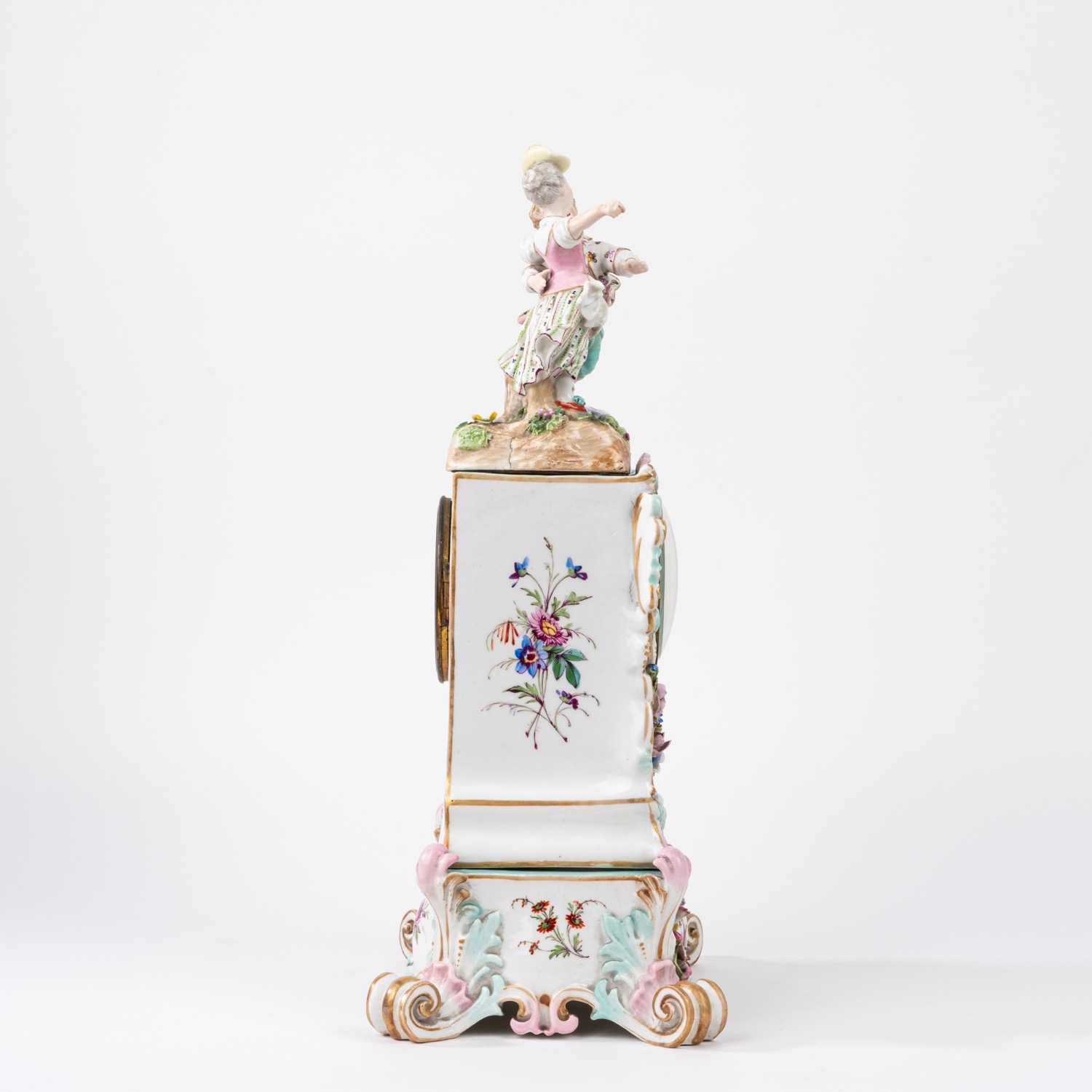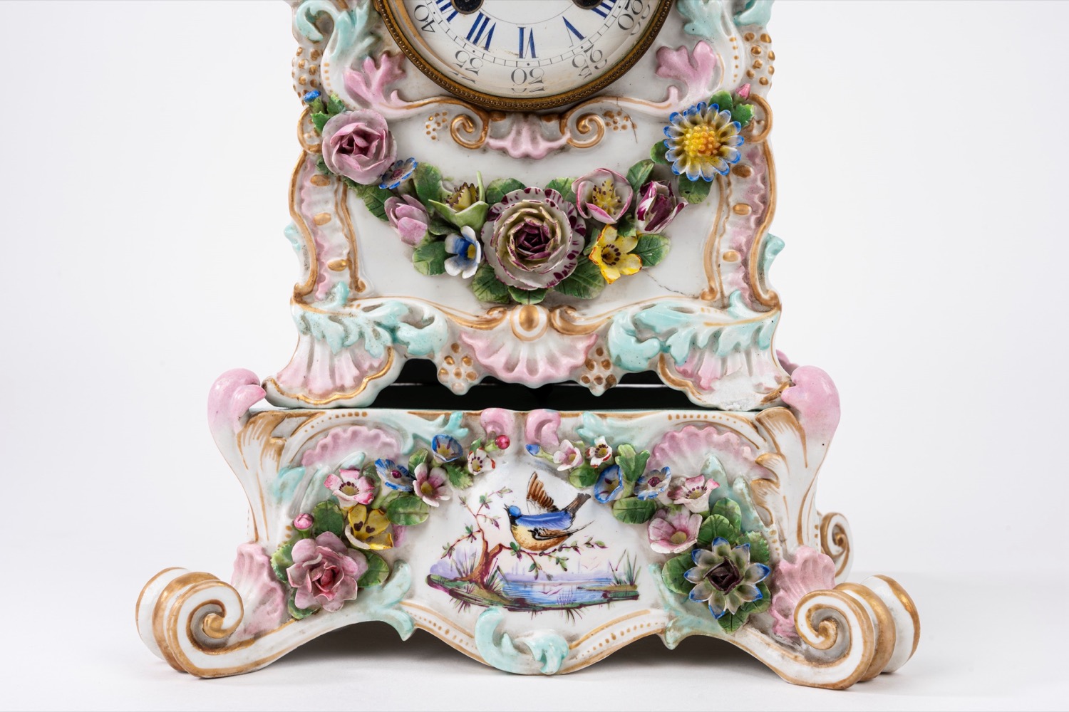 con coppia danzante sulla sommità e festone di fiori attorno al quadrante, base in porcellana policroma