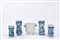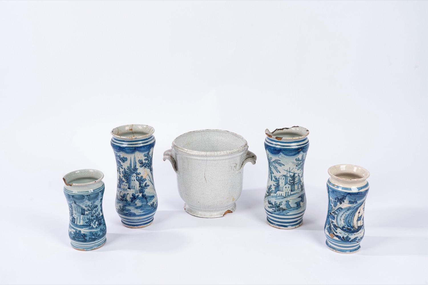 gli albarelli in maiolica bianca e blu, di cui 2 con sigla TR e uno con sigla AT e recanti data 1725; il vaso in maiolica bianca con manici a valva di conchiglia