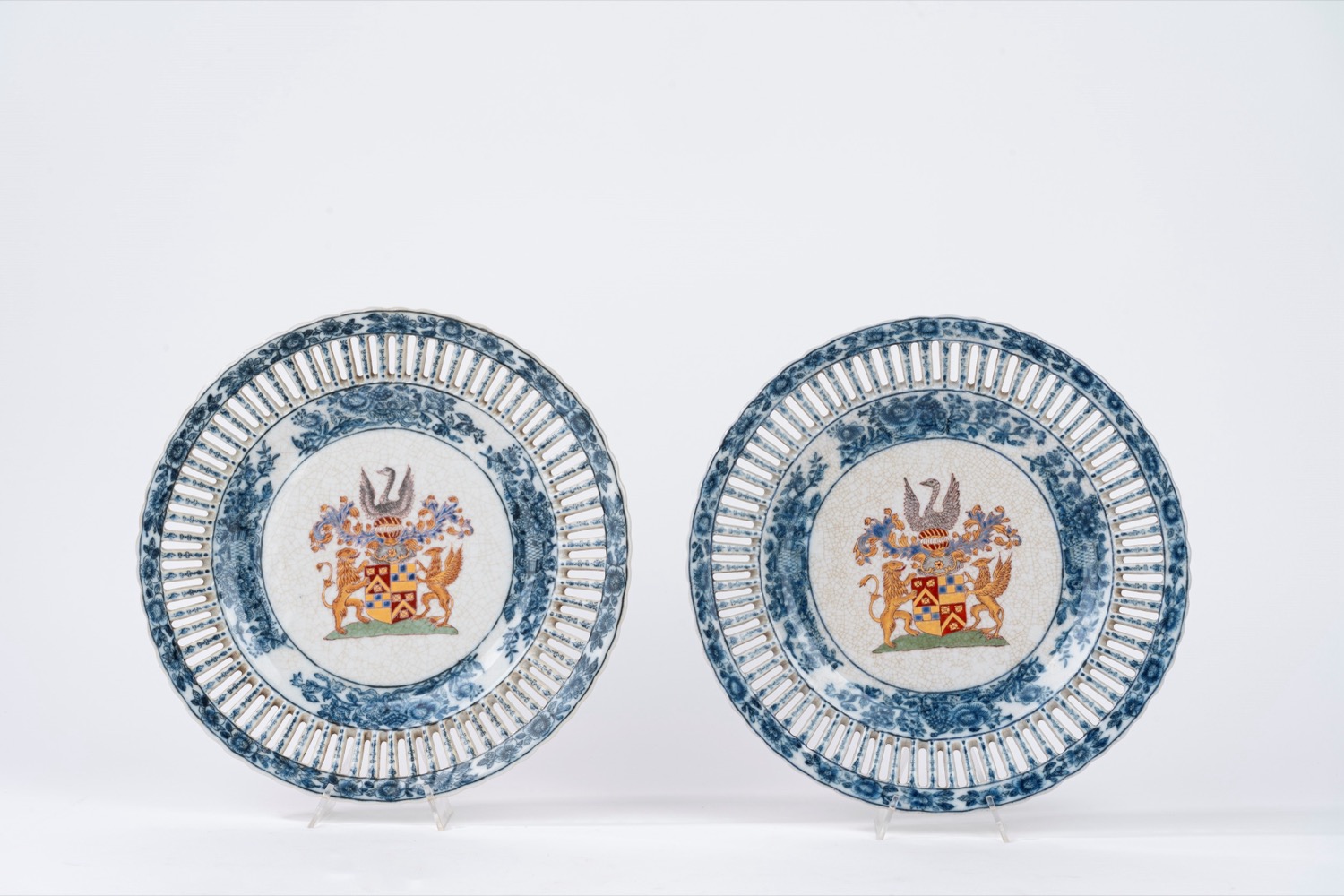Coppia di piatti con motivo a traforo e insegna araldica