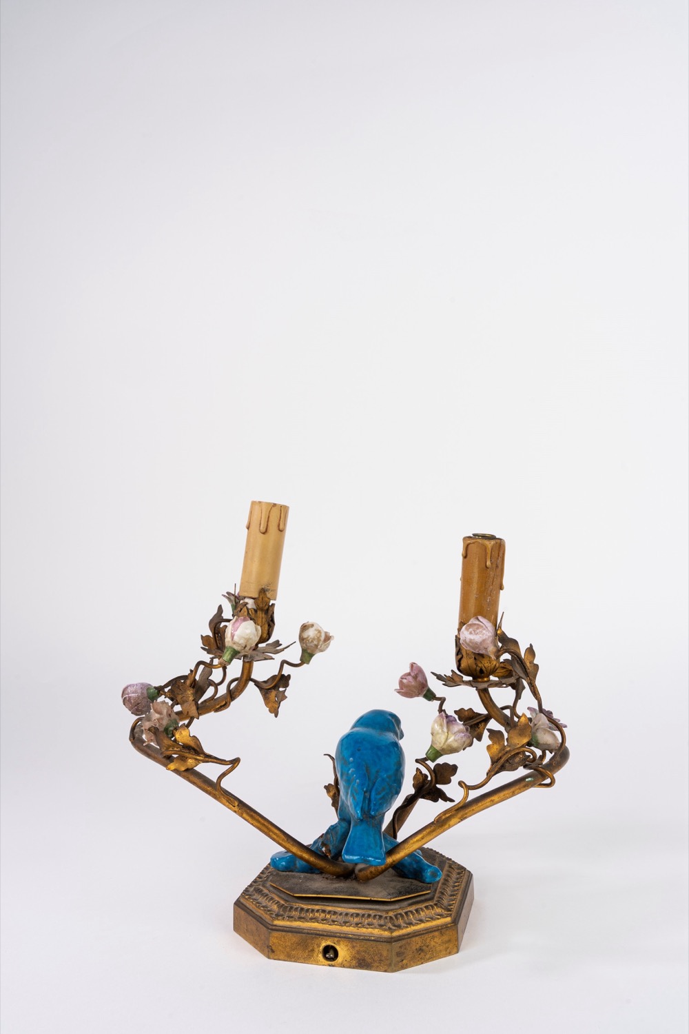 a due luci, con uccellino in porcellana blu e tralci fioriti