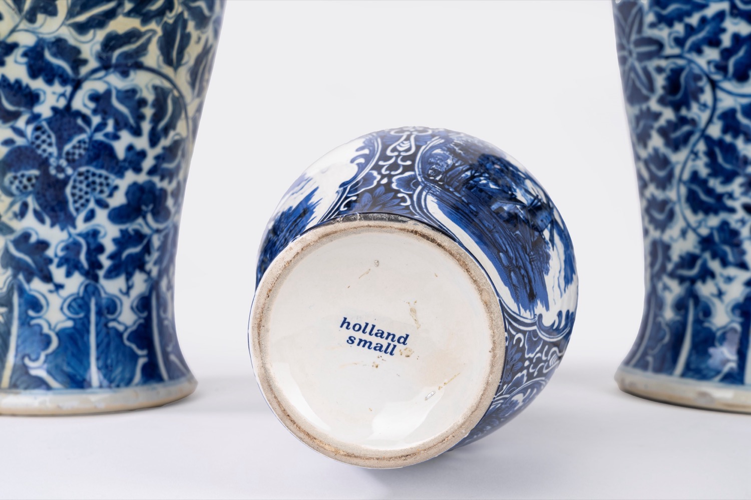 Due potiche cinesi in porcellana e un vasetto olandese in porcellana bianca e blu, secolo XX