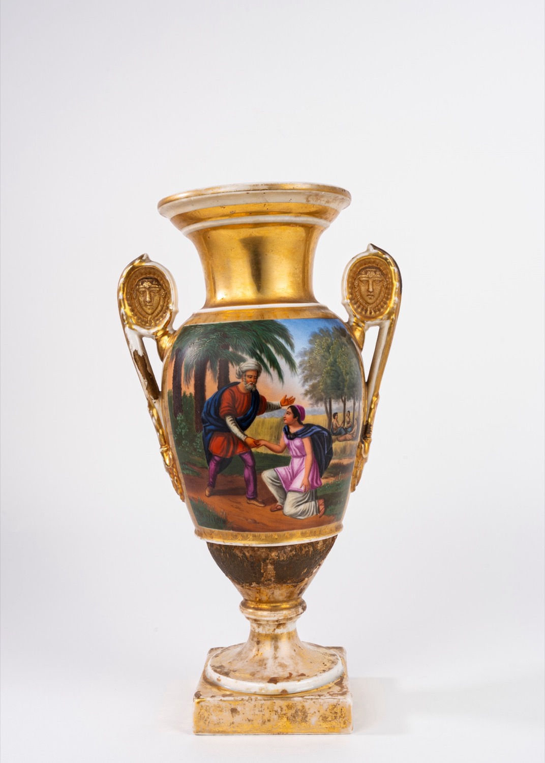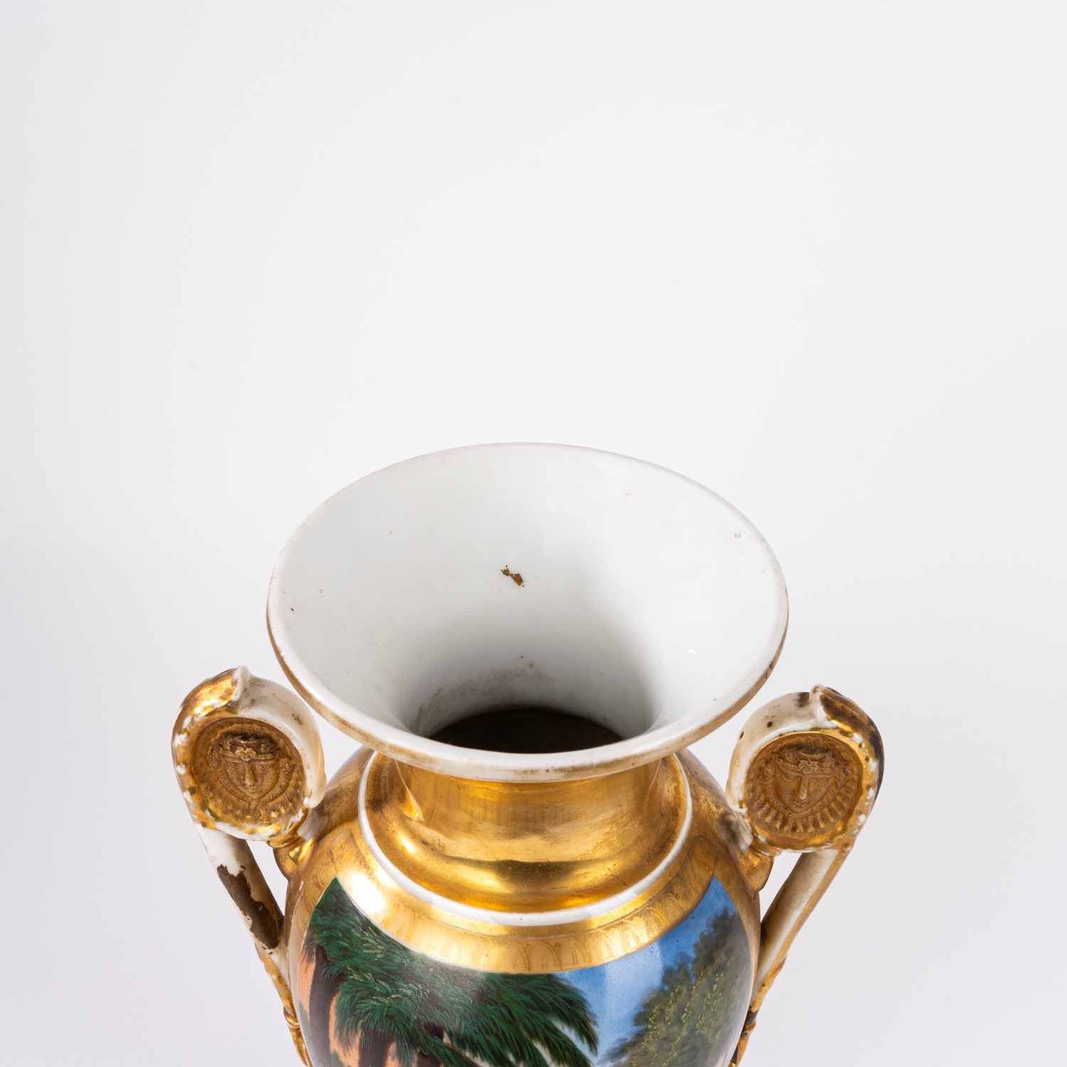 difetti e mancanze, parte della base mancante sostituita con elemento in legno sagomatodecorato con paesaggio costiero e scena storica, anse con testine dorate