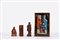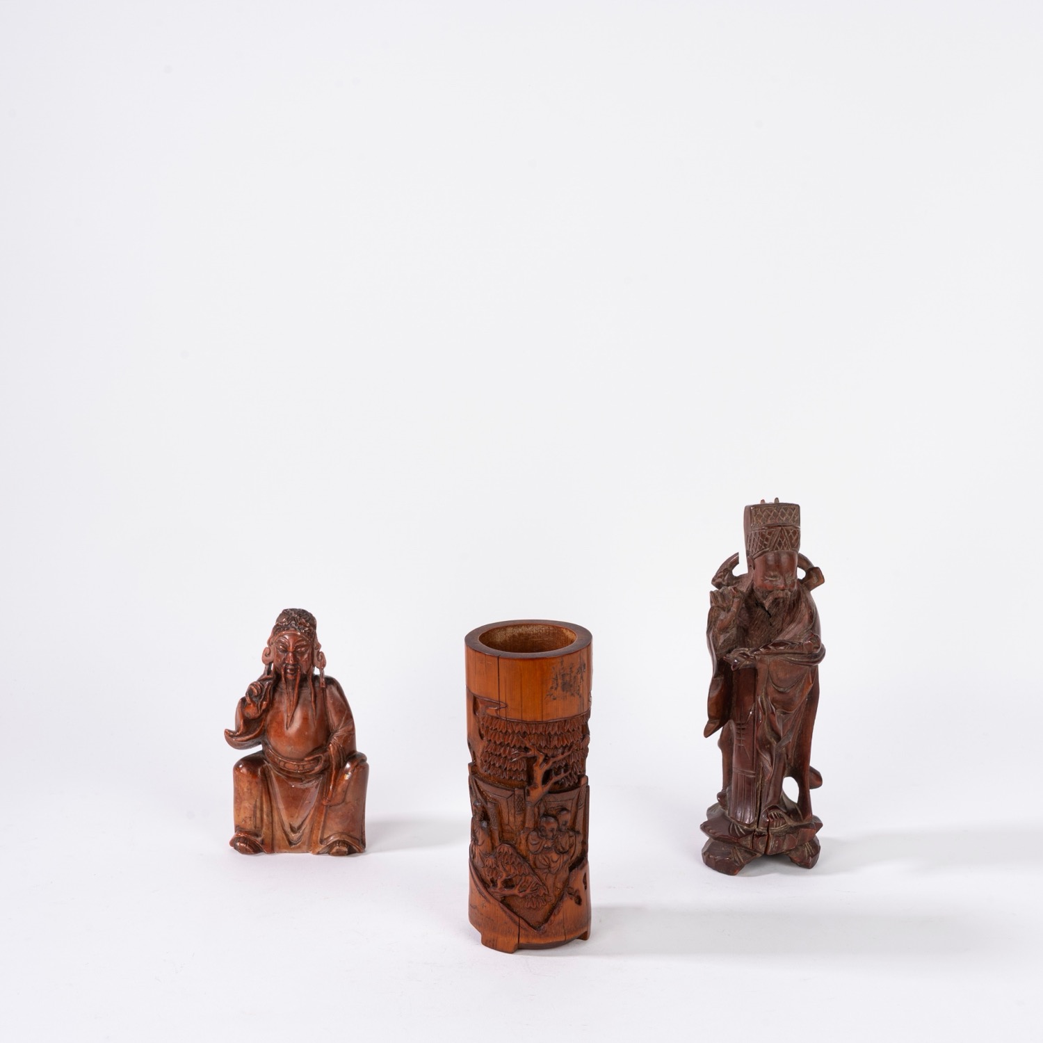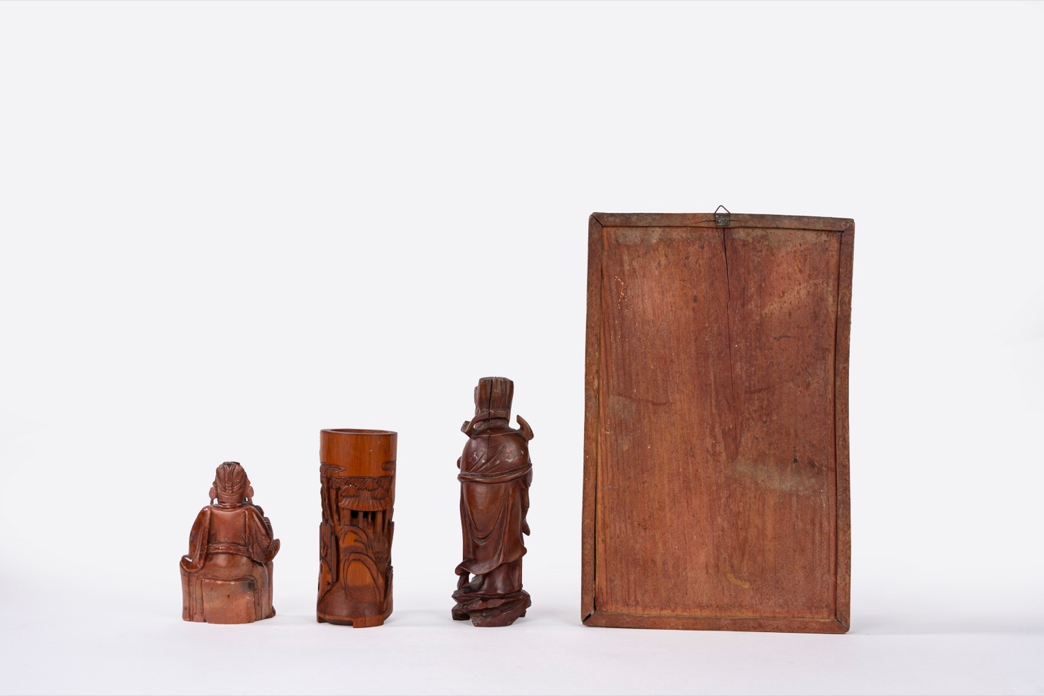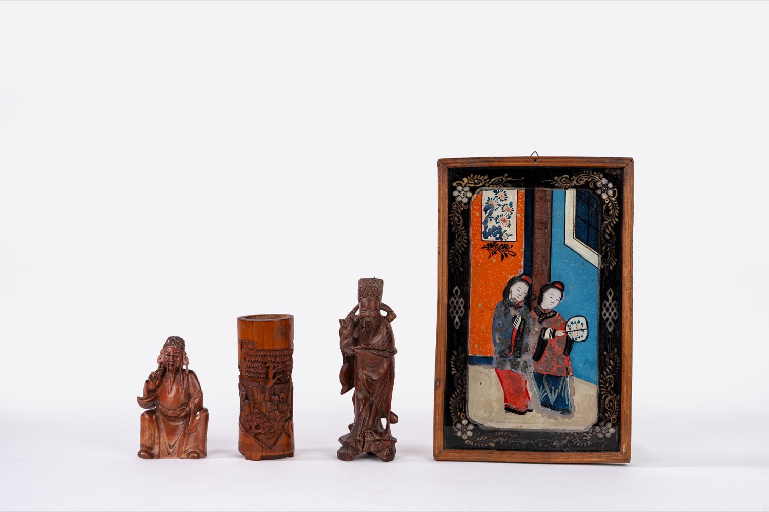un dipinto sottovetro raffigurante due cortigiane, un bitong in bambù, una scultura in legno e una in pietra saponaria un dipinto sottovetro raffigurante due cortigiane, un bitong in bambù, una scultura in legno e una in pietra saponaria