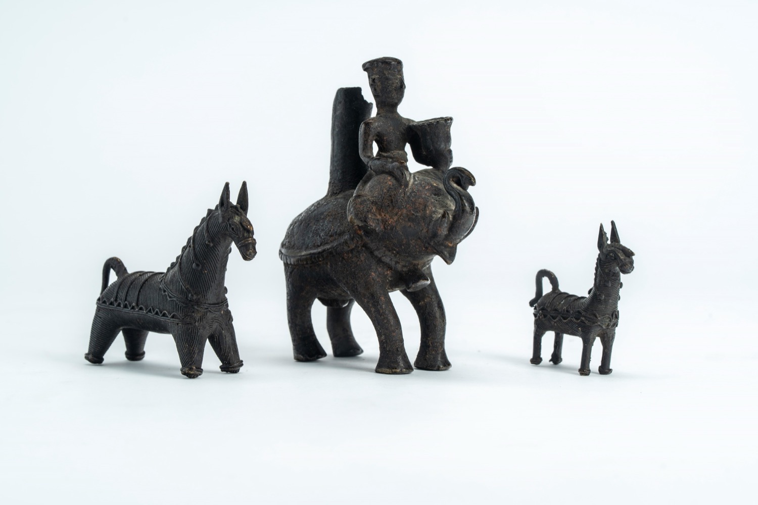 due raffiguranti cavalli votivi e un incensiere a guida di elefante con cavalieredue raffiguranti cavalli votivi e un incensiere a guida di elefante con cavaliere