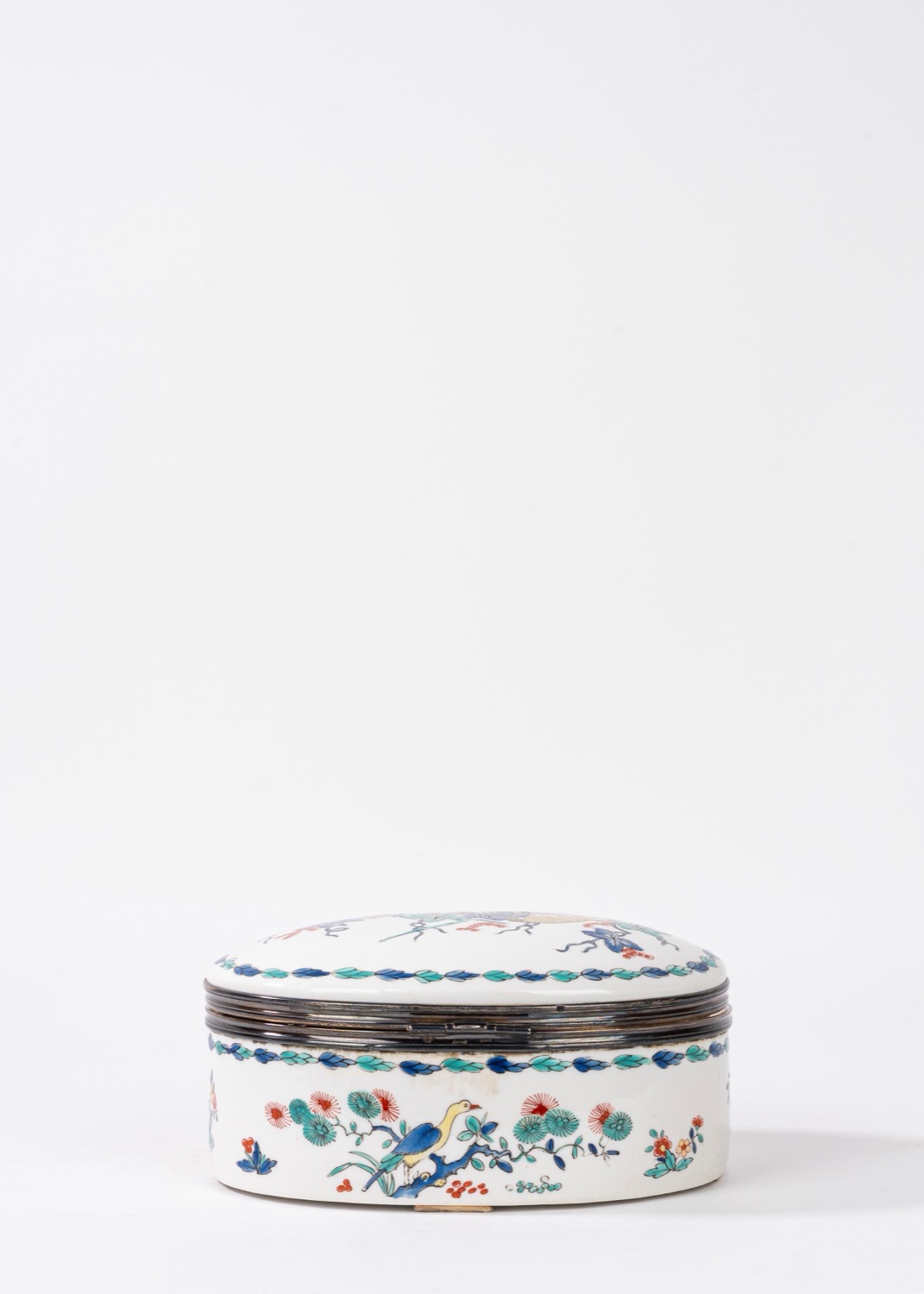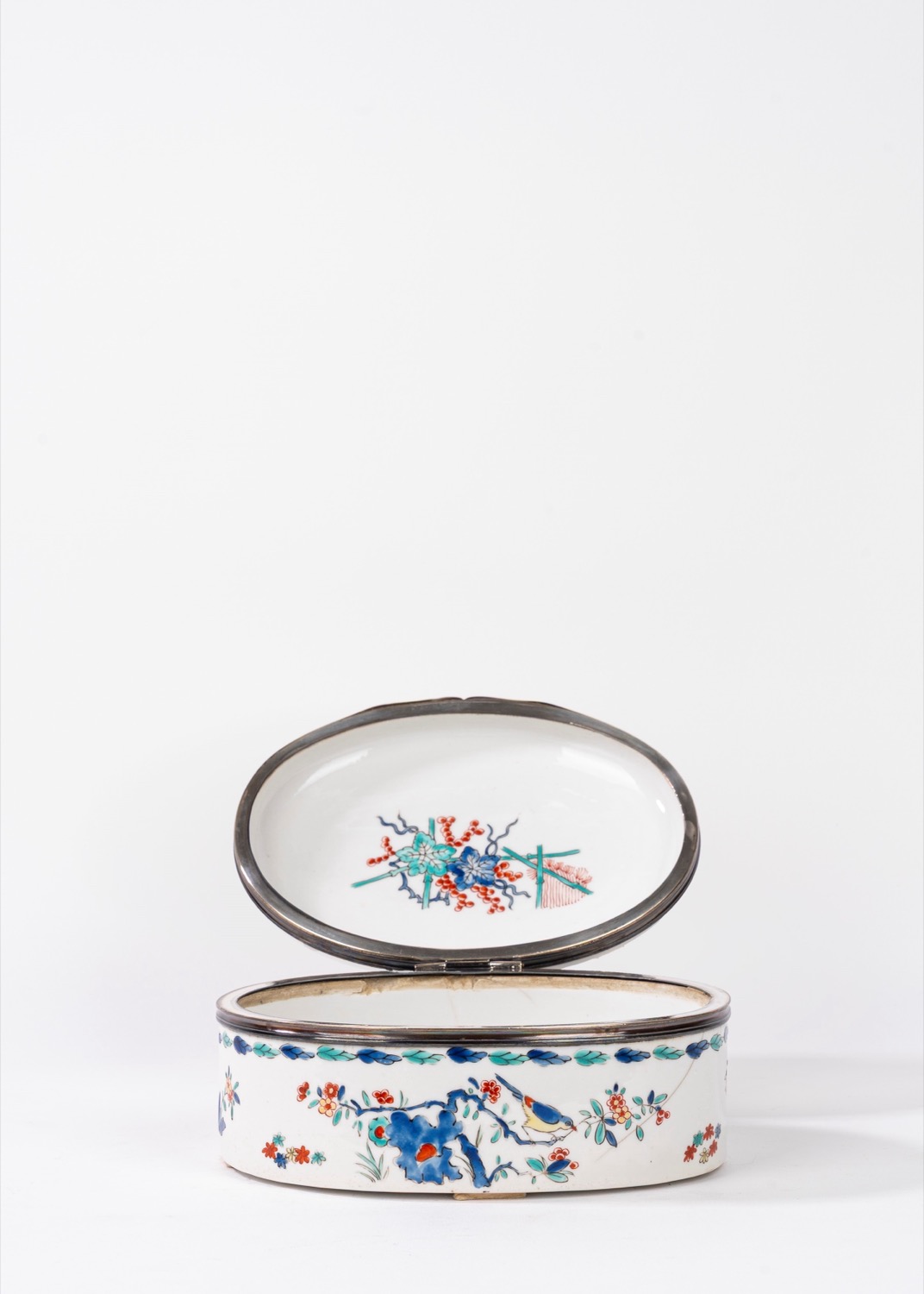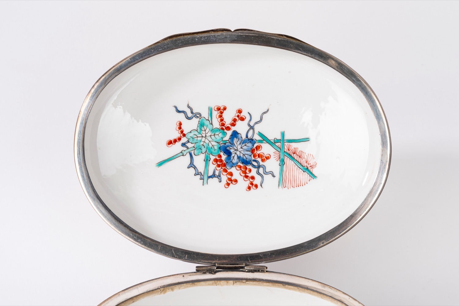Scatola in porcellana bianca decorata in policromia a chinoiserie, con bordo in argento