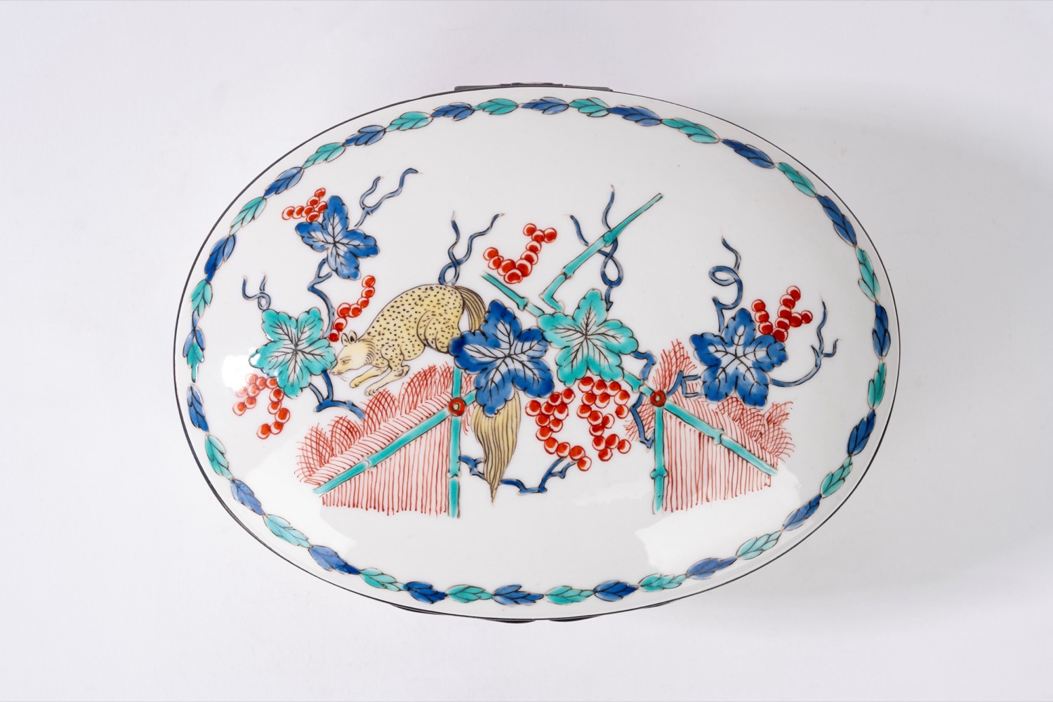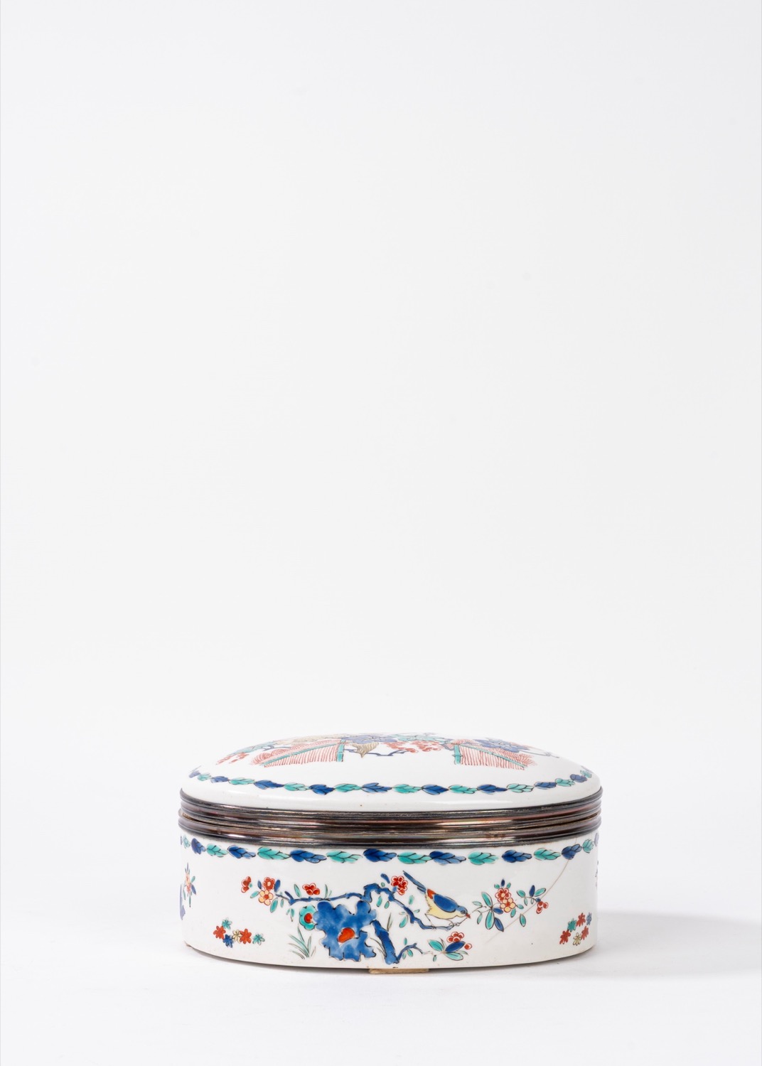 Lotto 602 | Scatola in porcellana bianca decorata in policromia a chinoiserie, con bordo in argento