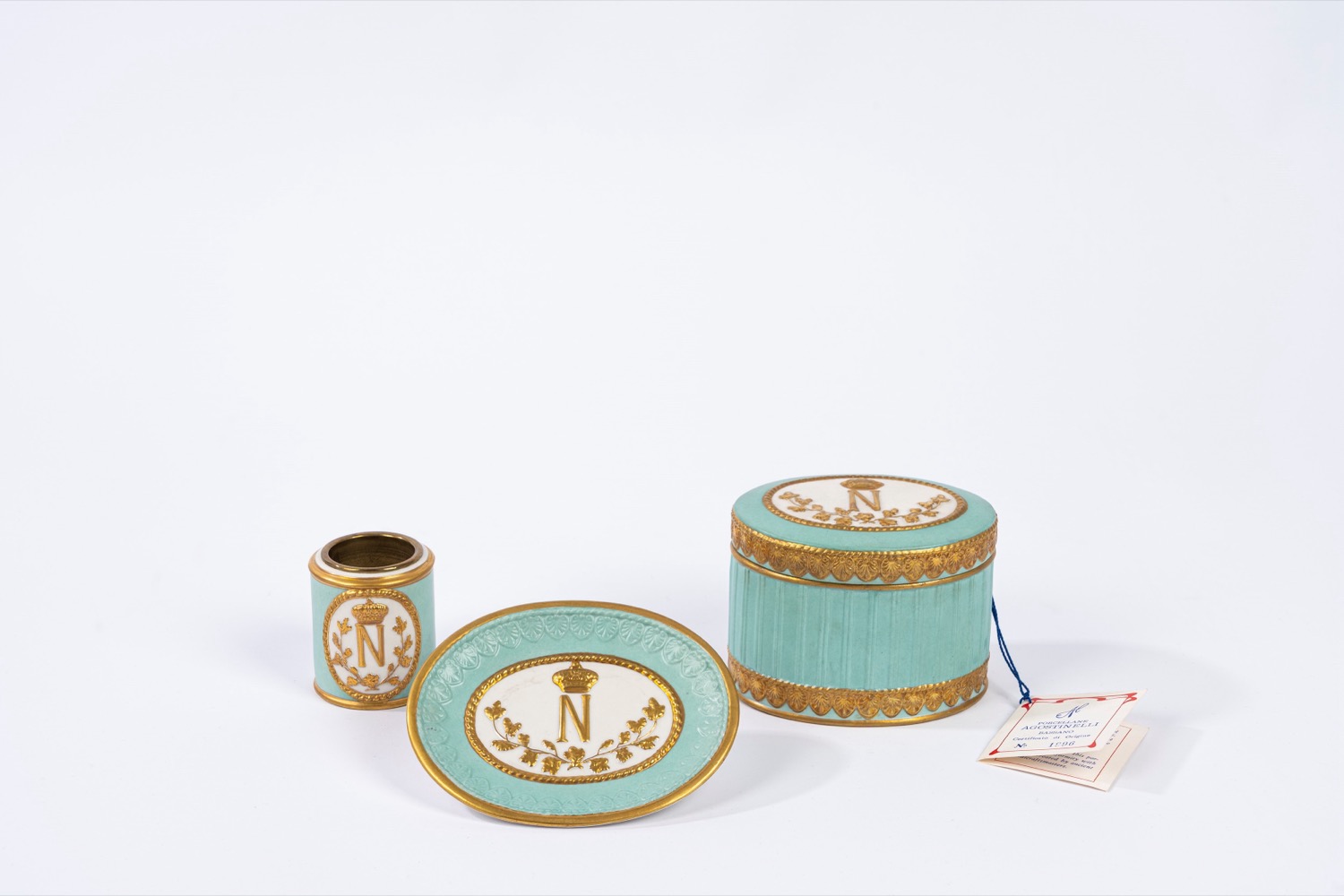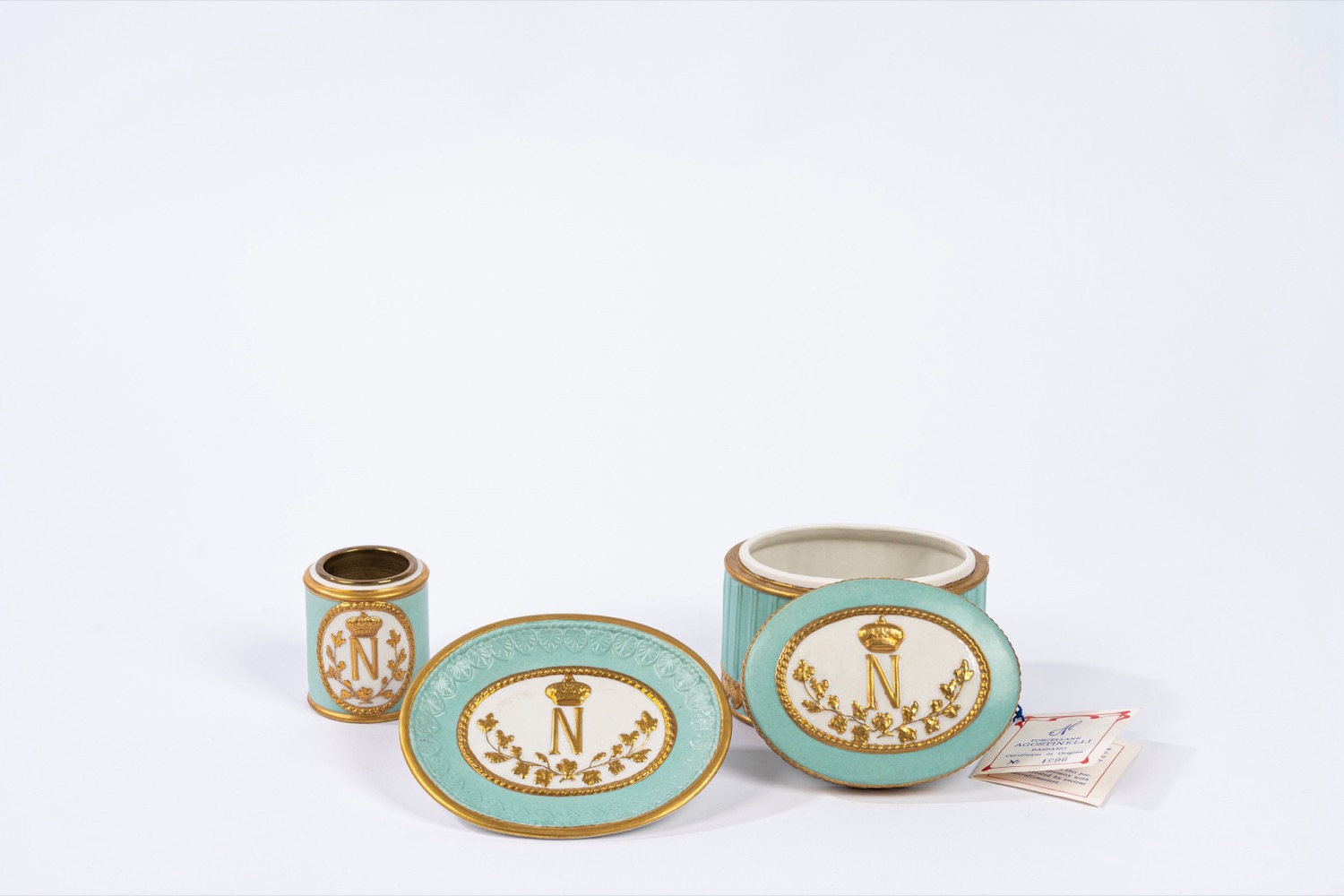 Set in porcellana verde acqua bianca e oro, manifattura Agostinelli Bassano