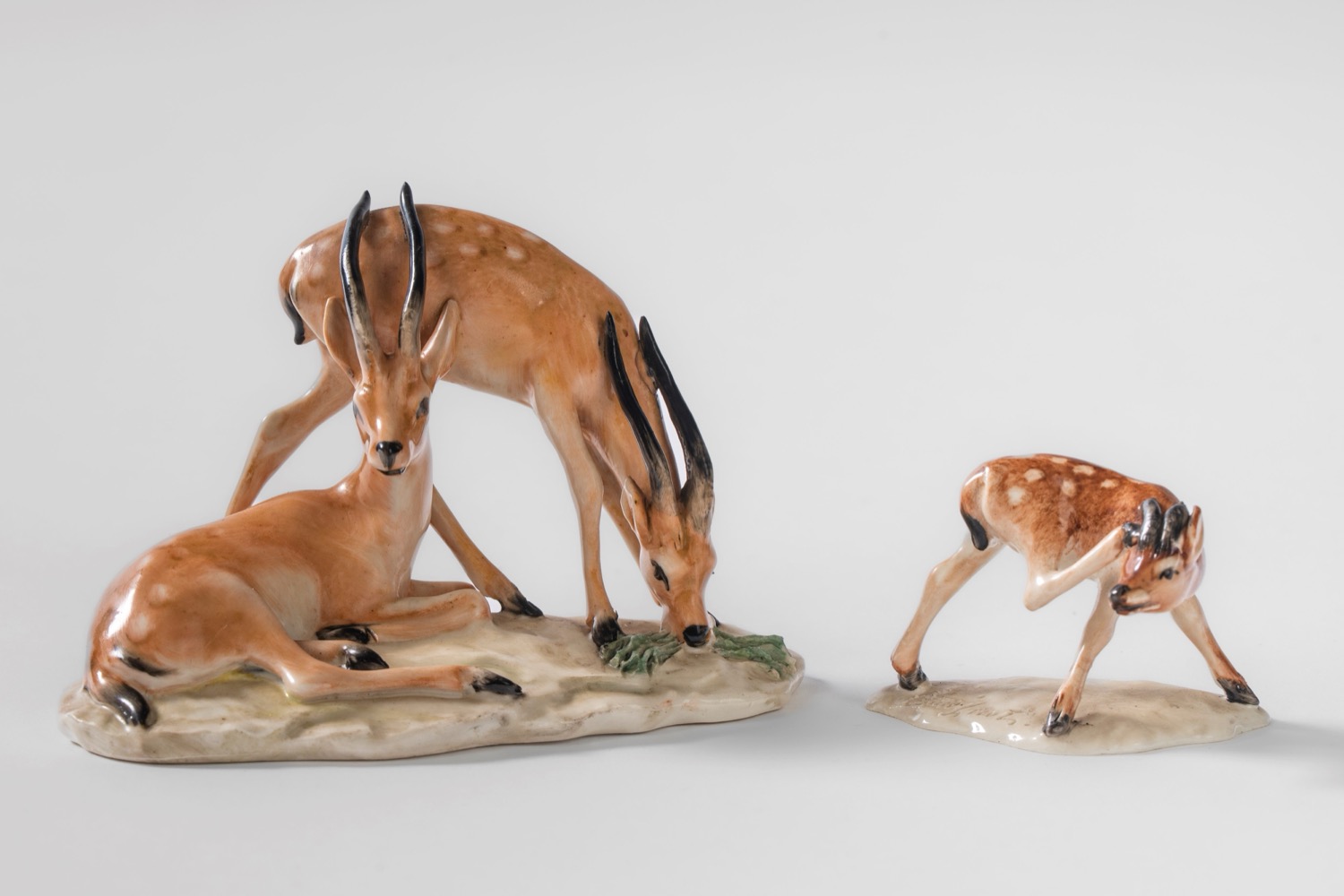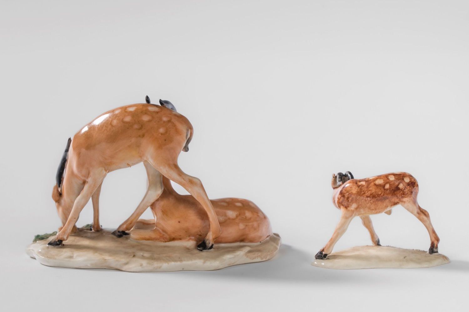Due gruppi in porcellana policroma raffiguranti cerbiatti.