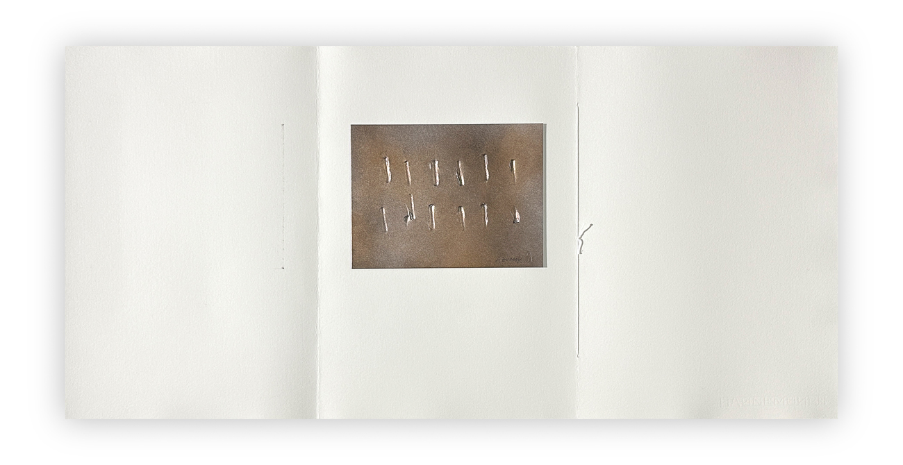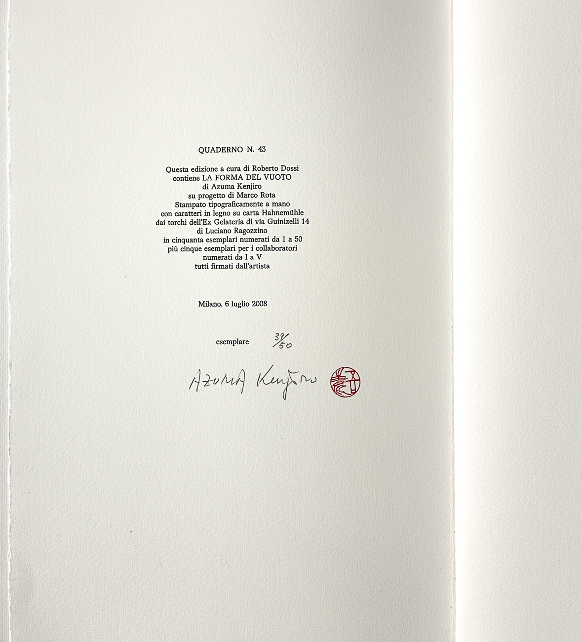 Edizione d'arte, curata da Roberto Dossi su progetto di Marco Rota, contenente 'La Forma del vuoto': progetto stampato tipograficamente a mano con caratteri in legno su carta Hahnemühle e costituiuto da liriche e opere originali di Kenjiro Azuma