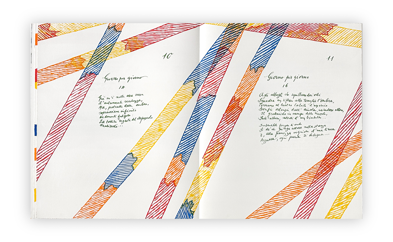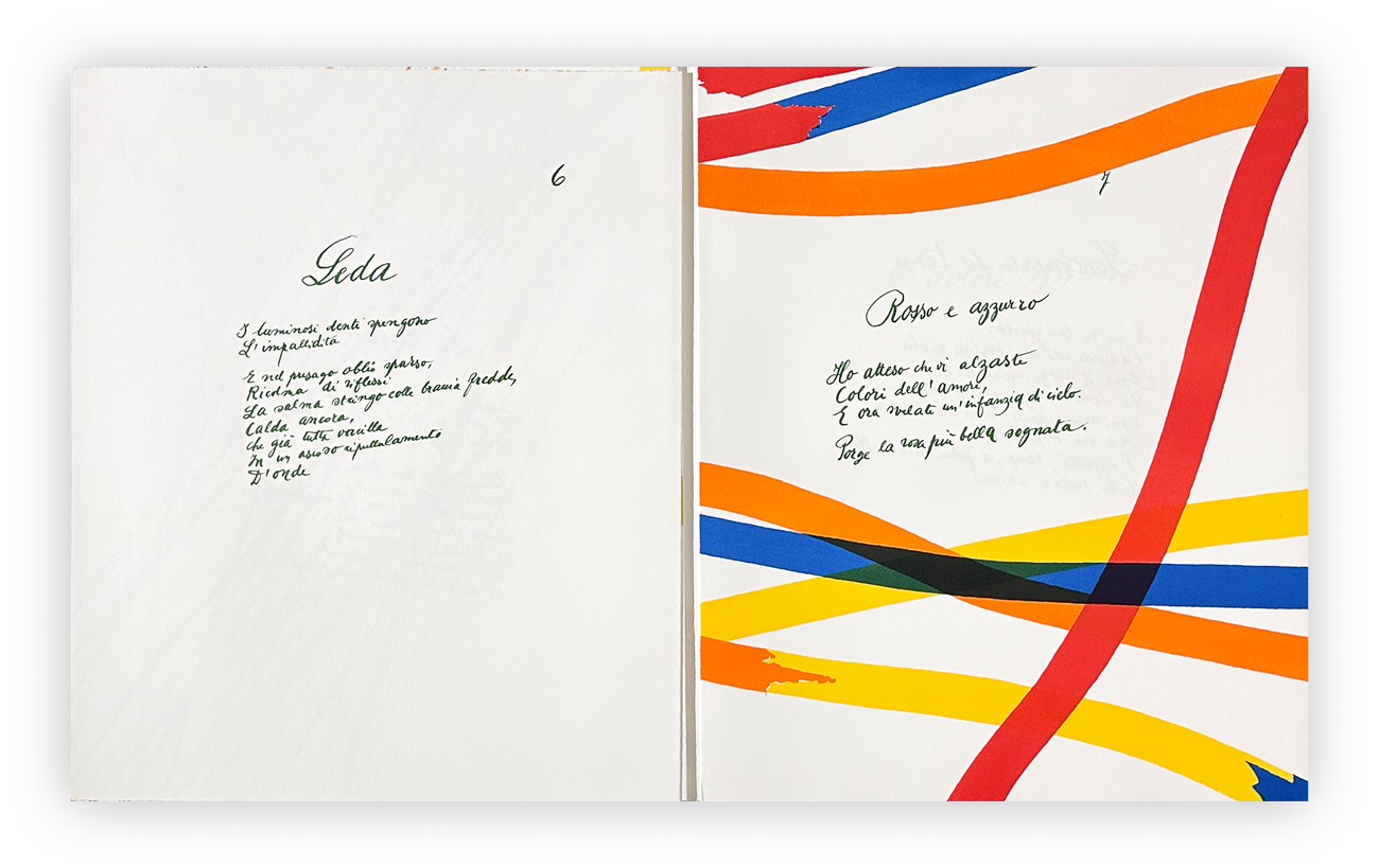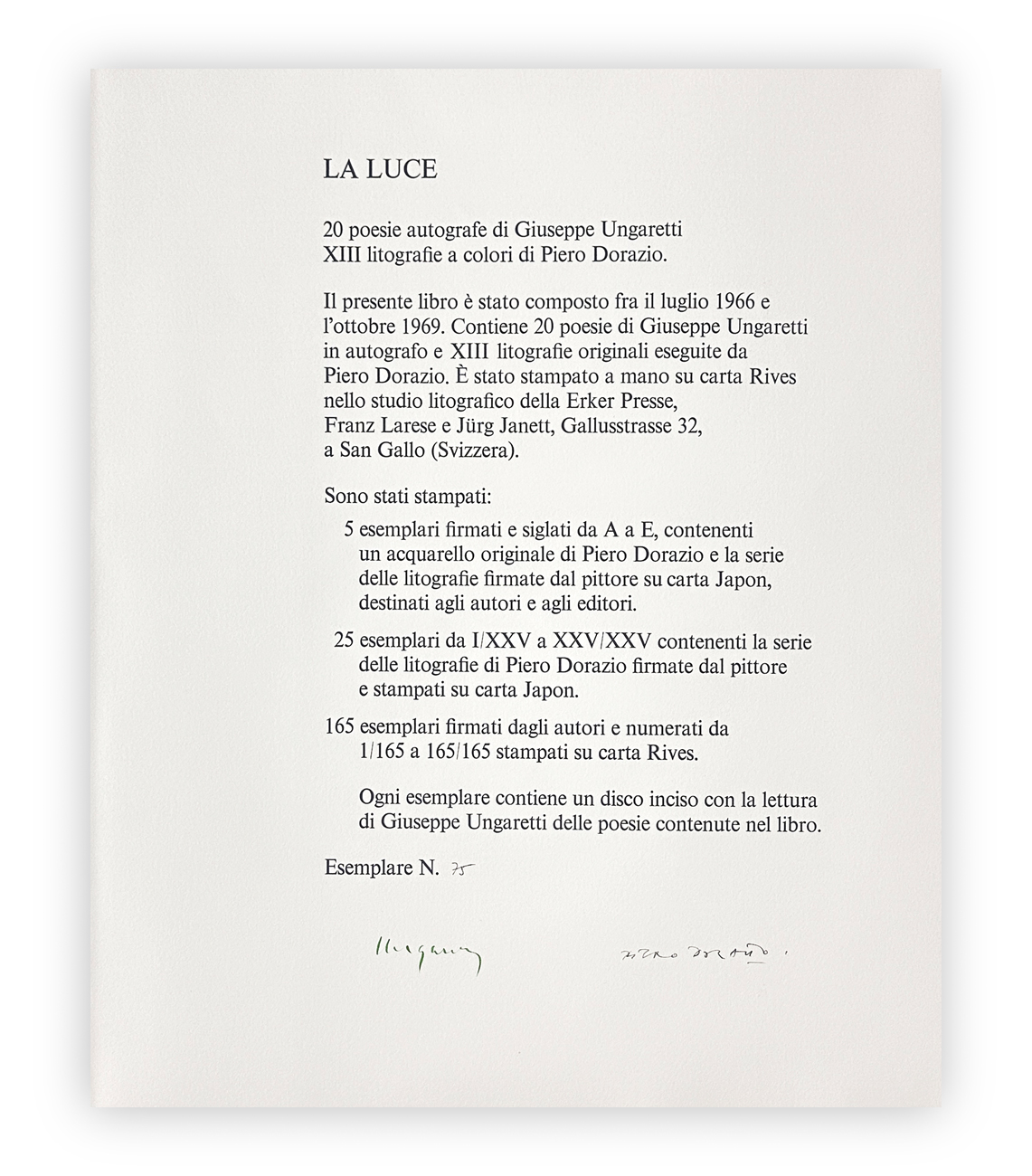 Edizione d'arte contenente 13 litografie di Piero Dorazio, 20 poesie di Giuseppe Ungaretti e un disco inciso con la lettura di Giuseppe Ungaretti, firma degli autori e numerazione (Esemplare 75/165) sul colophon