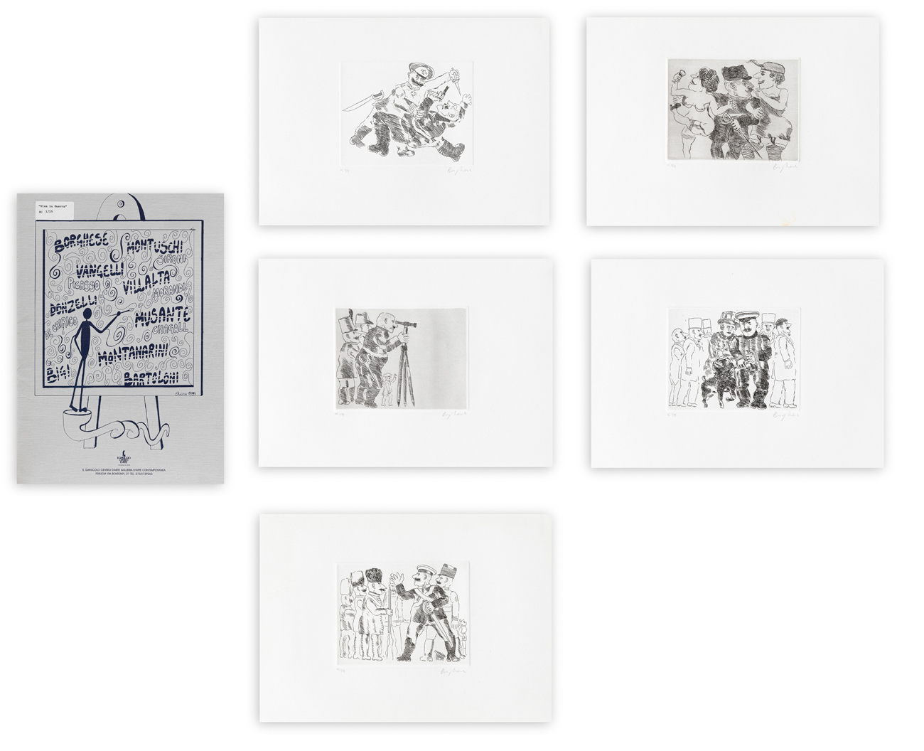 Folder contenente 5 acqueforti di Franz Borghese firmate e numerate (Esemplare HC 1/15) a matita al fronte