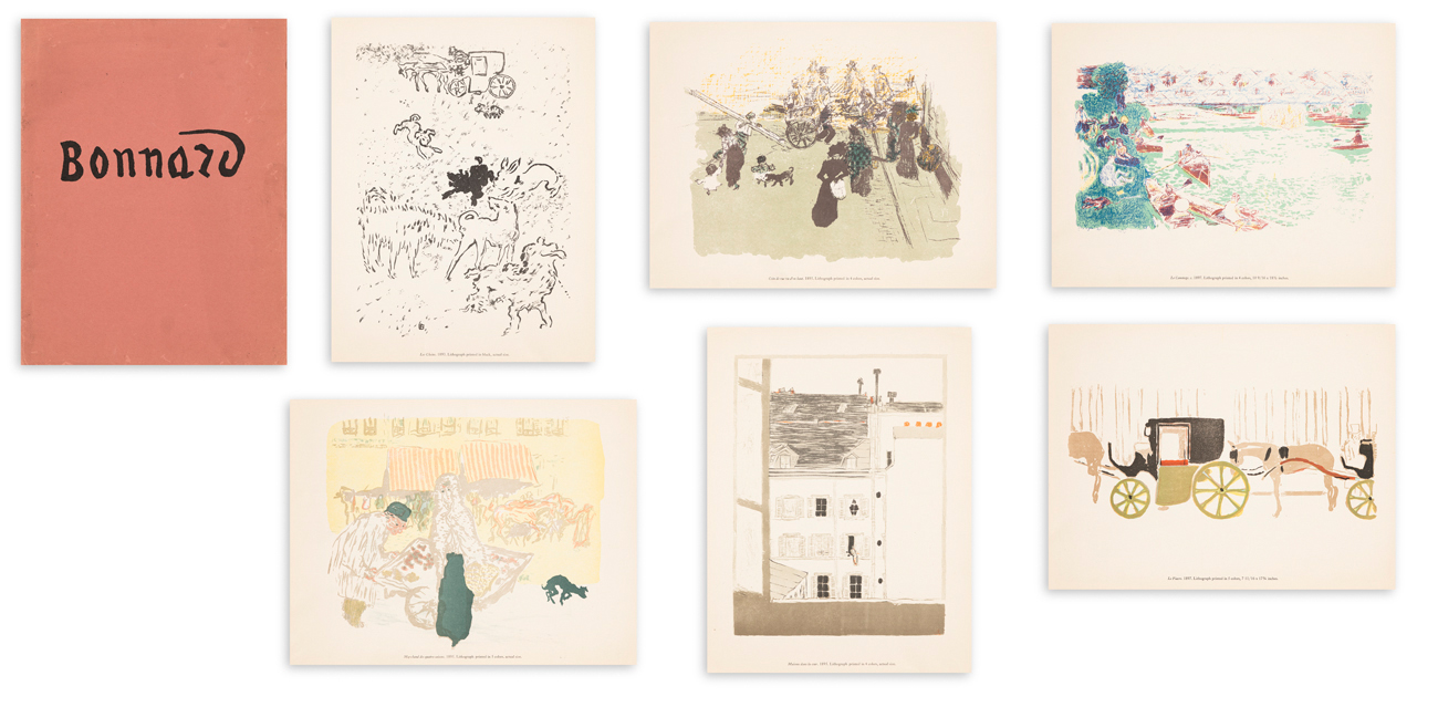 Cartella contenente 5 riproduzioni di Pierre Bonnard, nello specifico le tavole 2, 3, 4 e 5 dalla cartella "Quelques aspects de la vie de Paris"