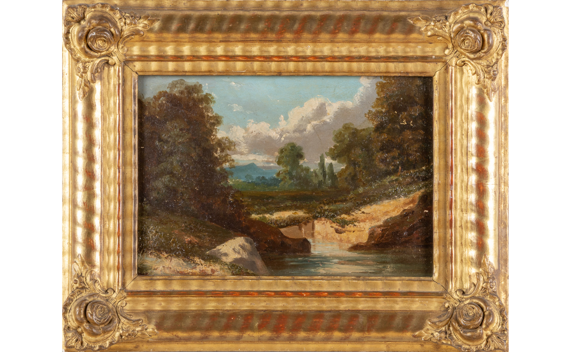 Lotto 0372 | Paesaggio con torrente<br>olio su tavoletta,