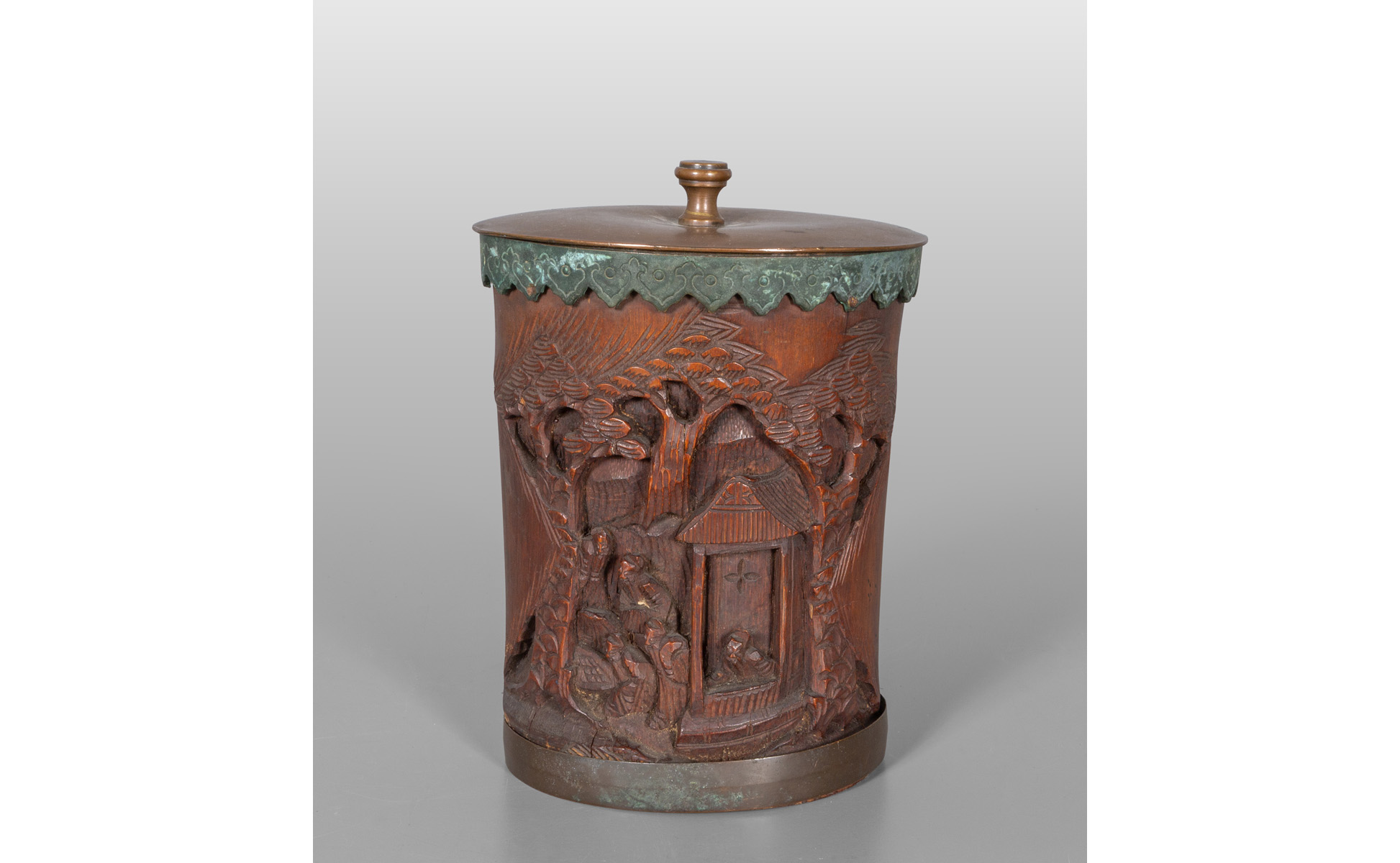 Scatola in bambù intagliato a paesaggio base e coperchio in rame Cina inizi sec.XX