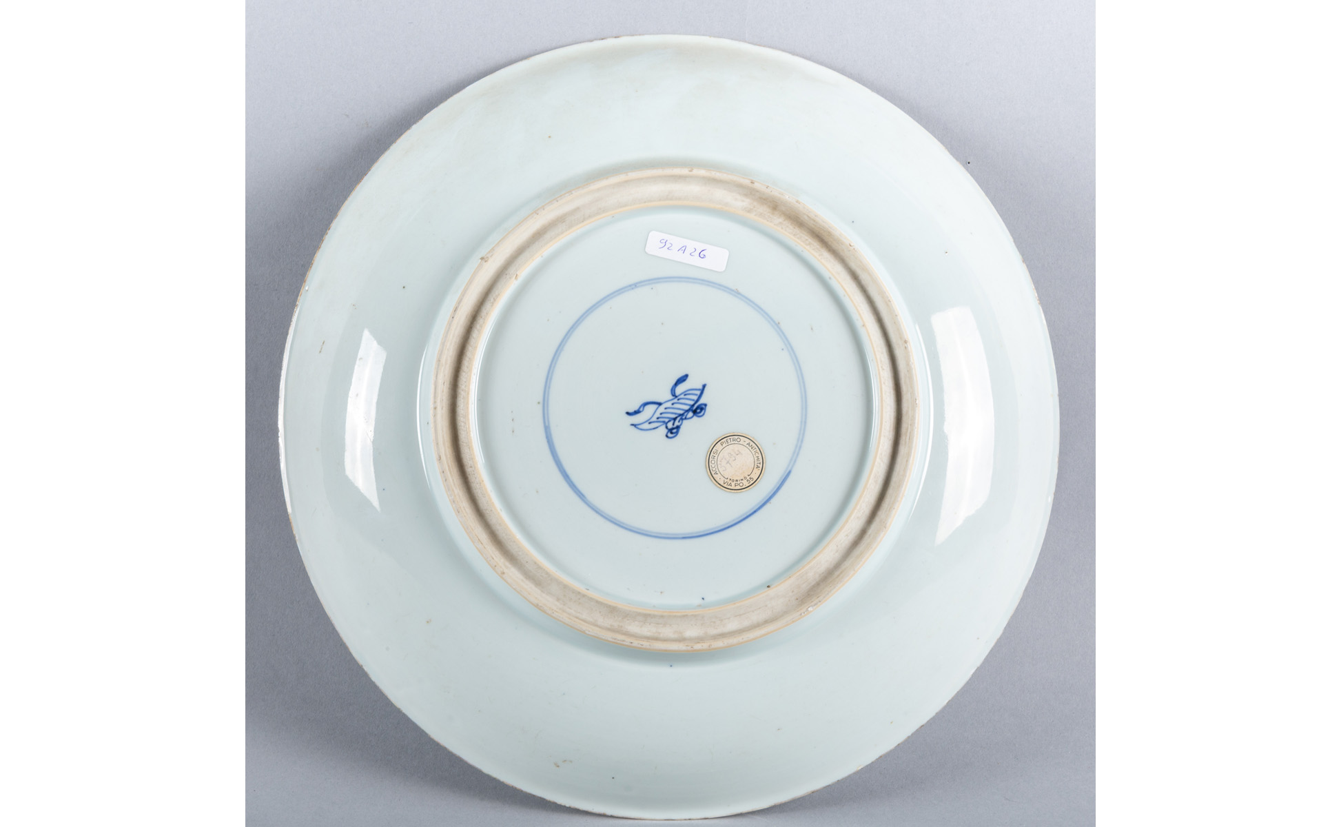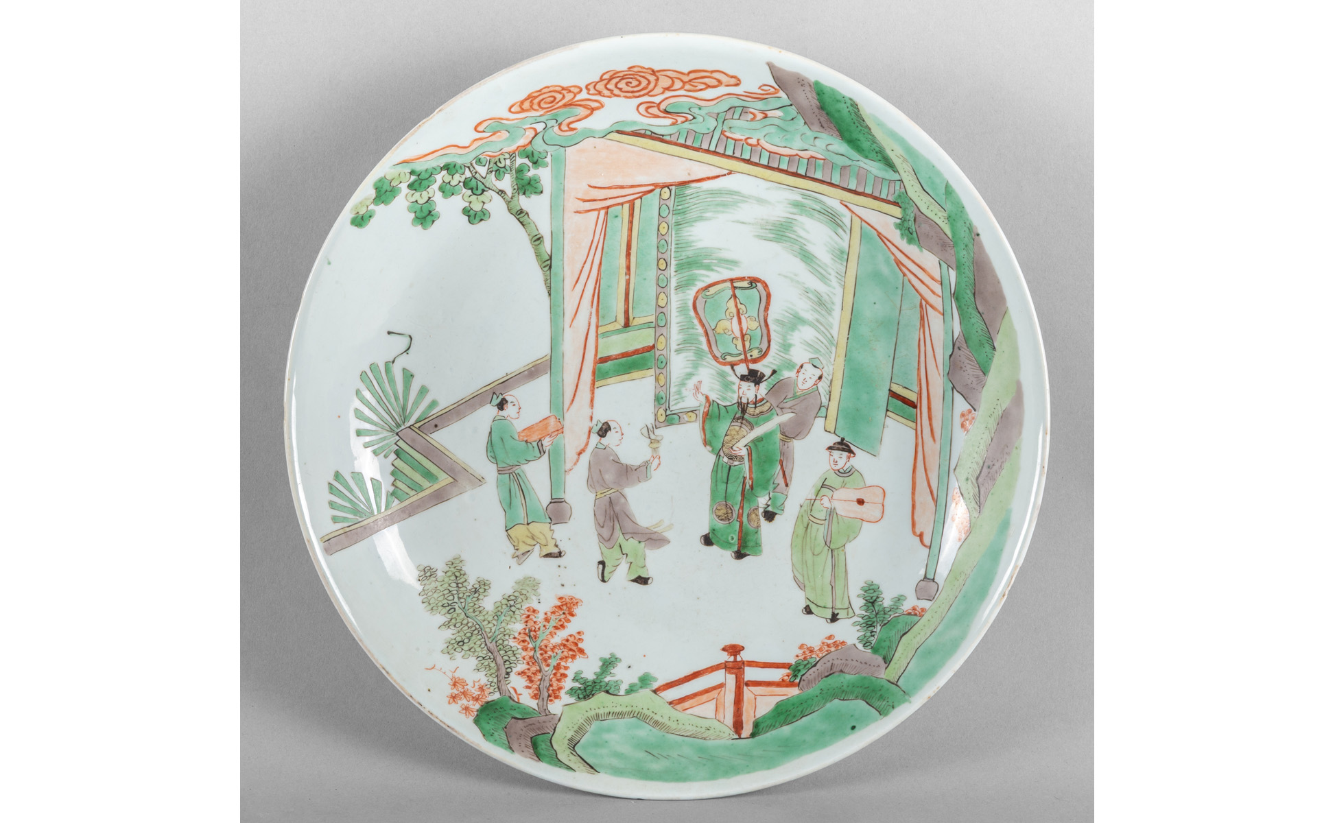 Piatto in porcellana famiglia Verde decorato con personaggi in un paesaggio Cina sec.XVIII