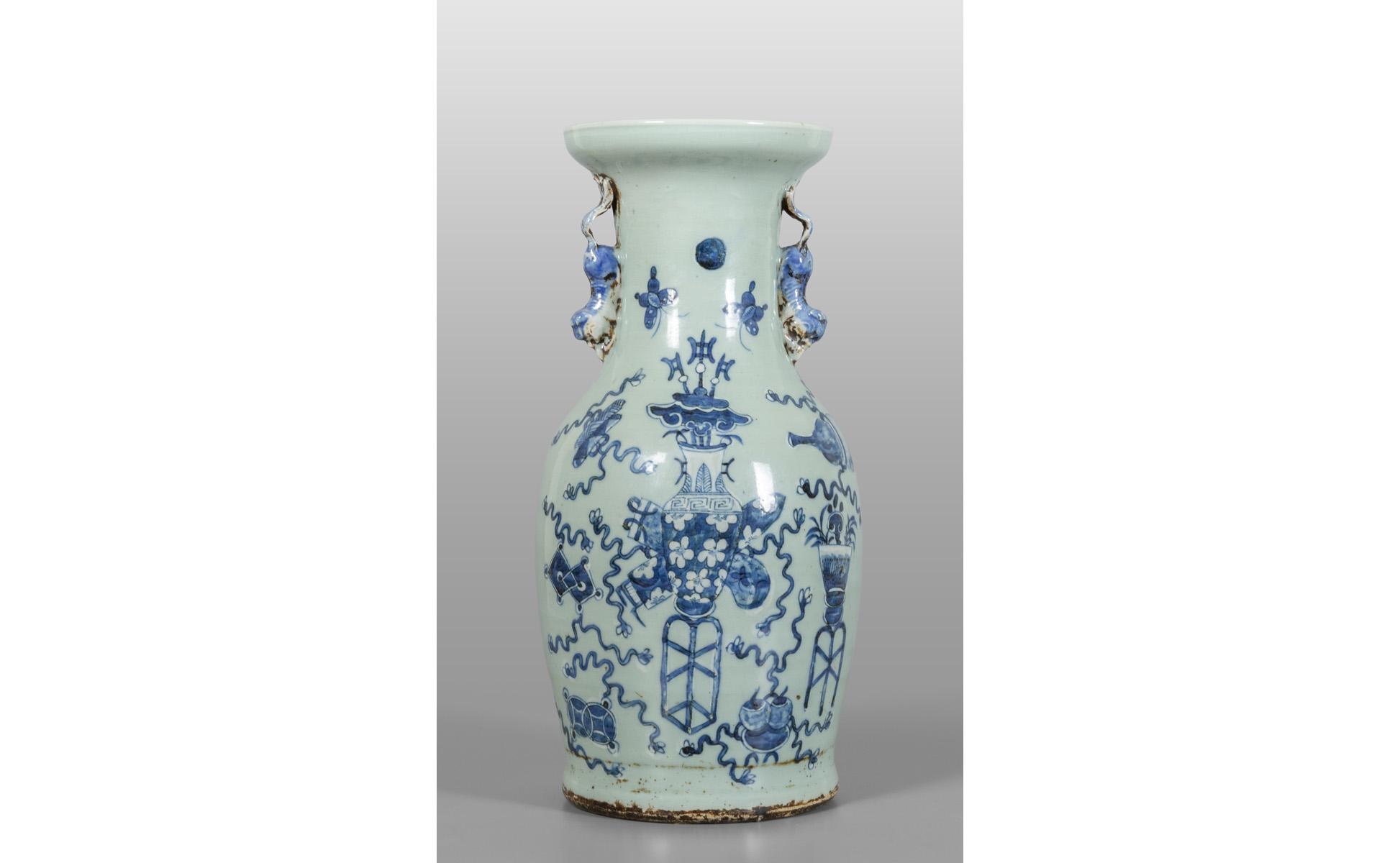 Vaso in porcellana a decorazione bianca e blu con vasi di fiori Cina sec.XIX