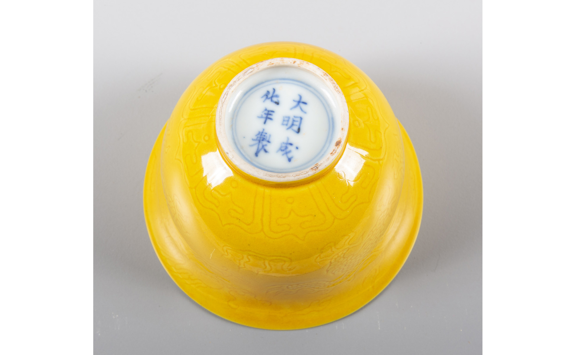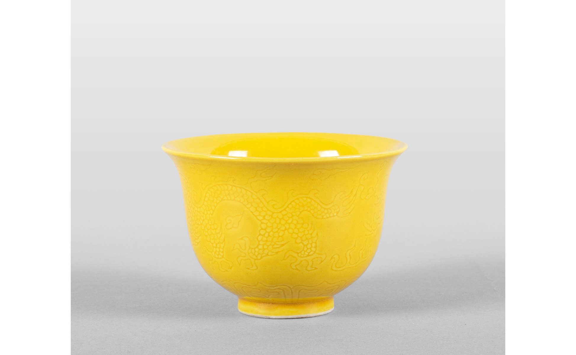 Coppa in porcellana a fondo giallo decorata con drago a tre dita marcata alla base Cina sec.XIX