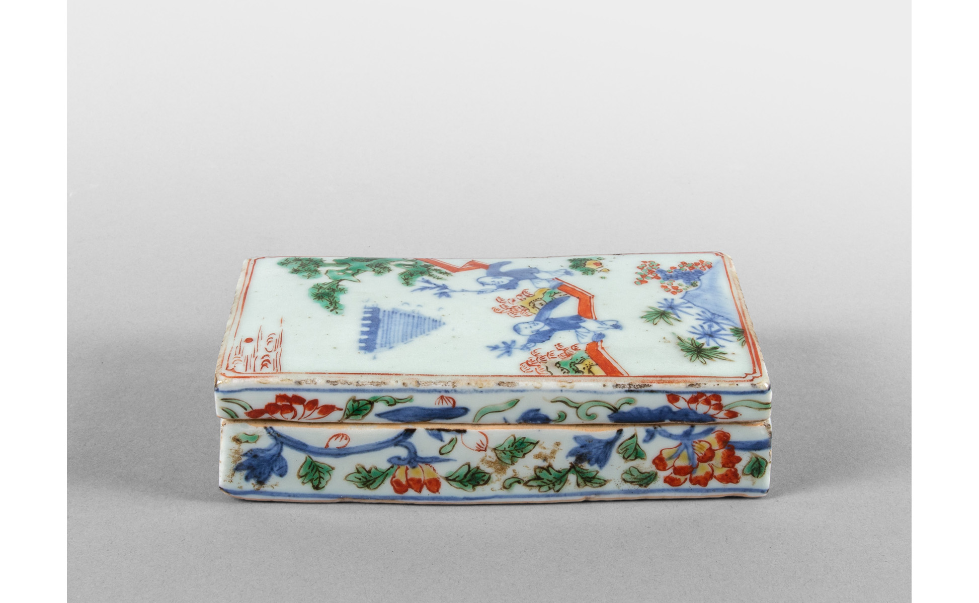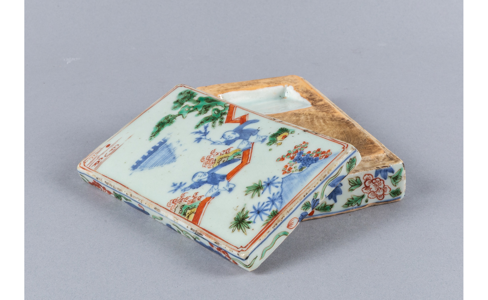Scatola portainchiostro in porcellana policroma decorata con giochi di bimbi Cina sec.XIX