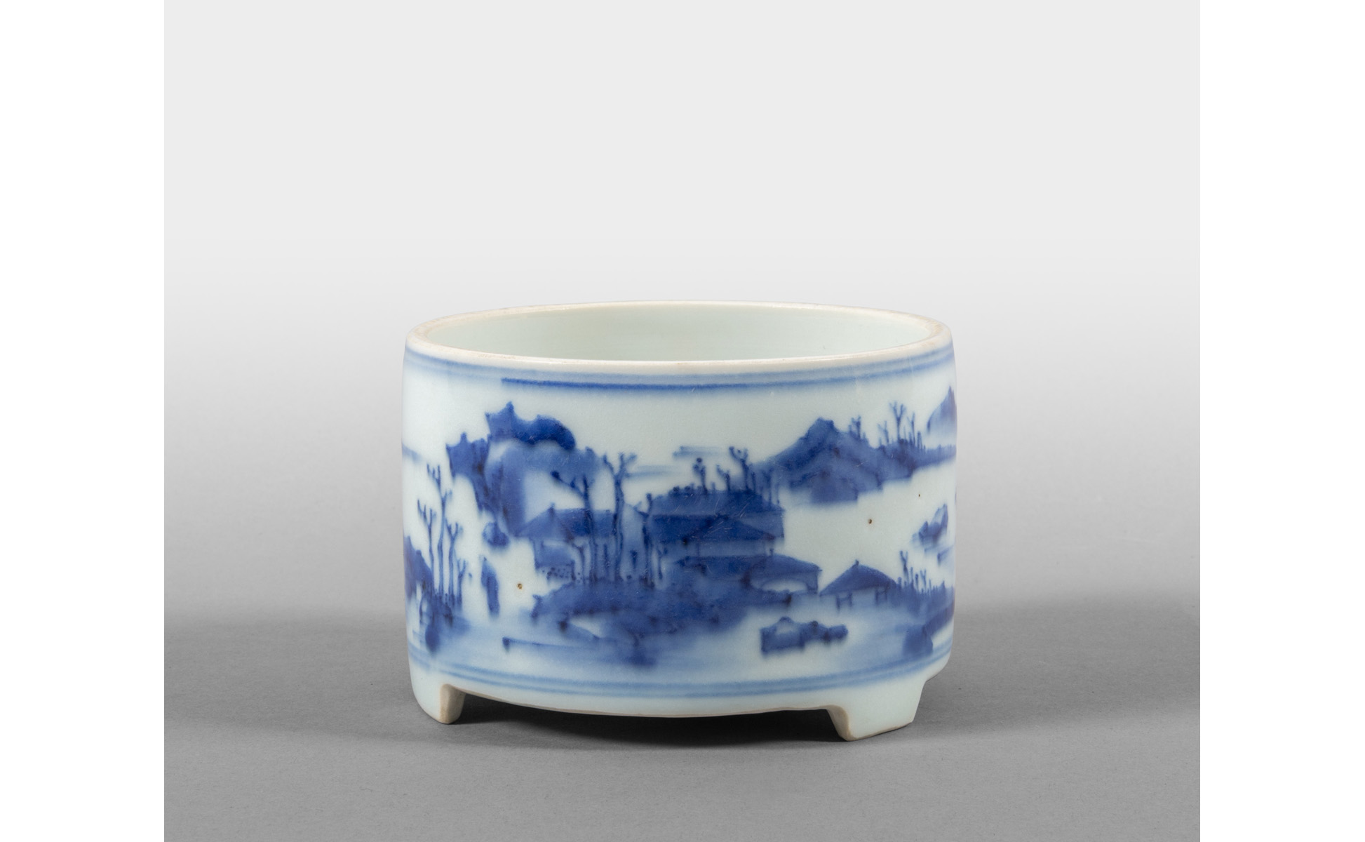 Portapenneli in porcellana bianca e blu decorato a paesaggio sec.XVIII