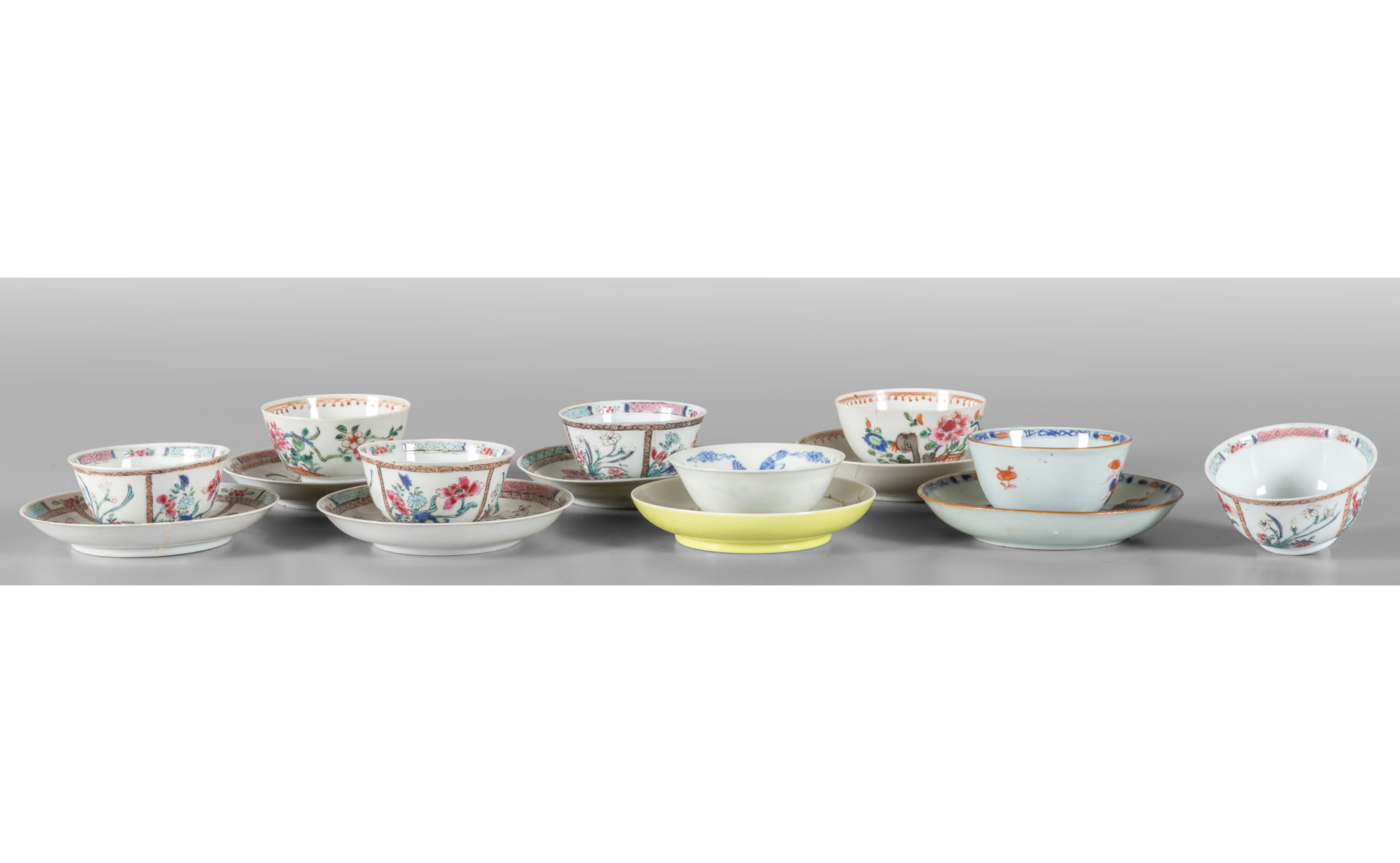 Lotto di sette piattini e otto tazzine in porcellana Cina fine sec.XVIII