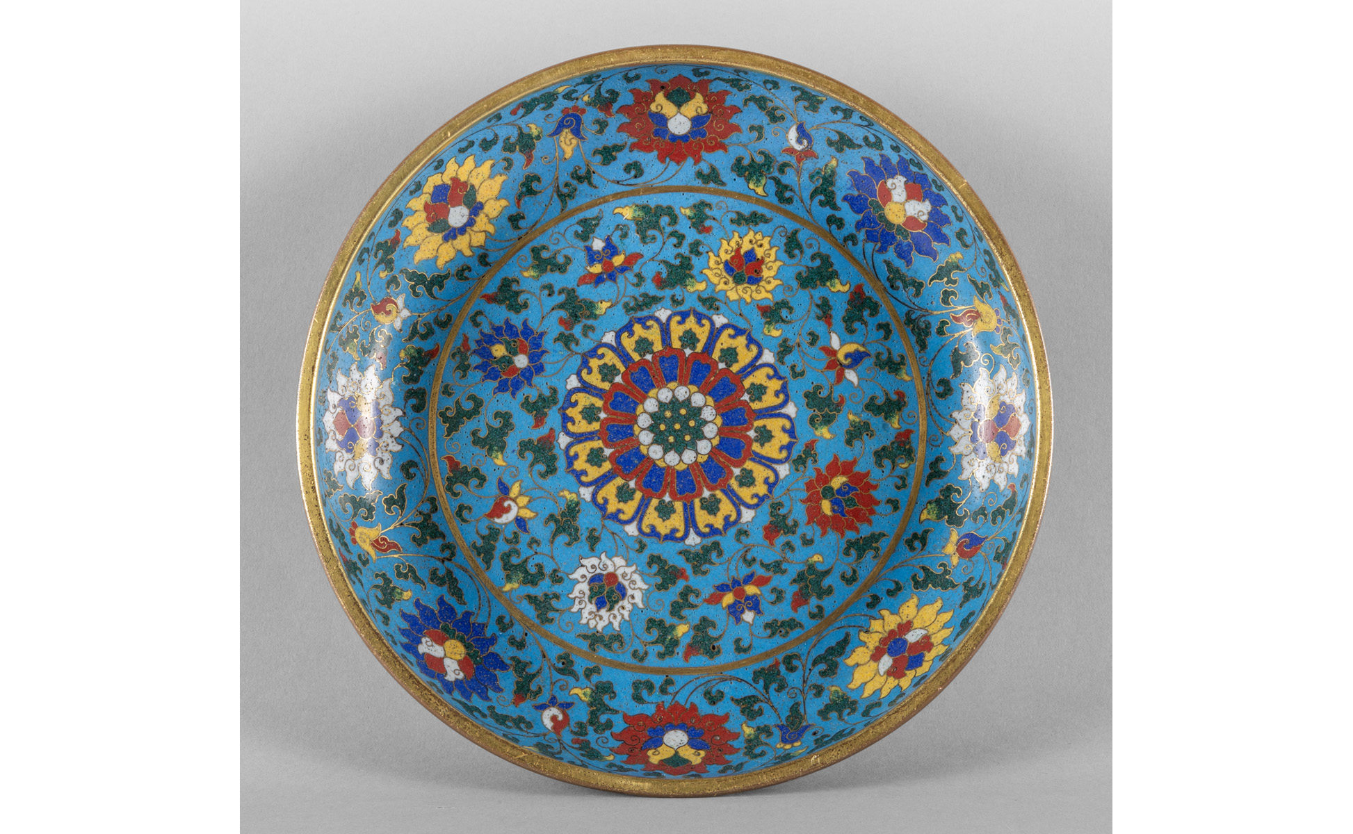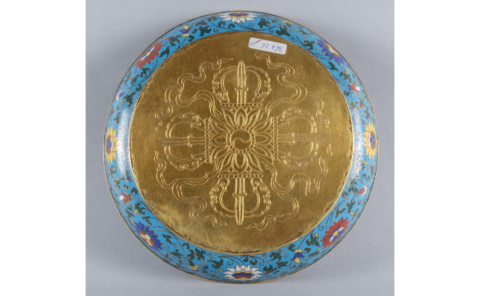 Piatto in bronzo dorato con decorazione in smalto cloisonnè a fondo azzurro con fiori in policromia Cina
