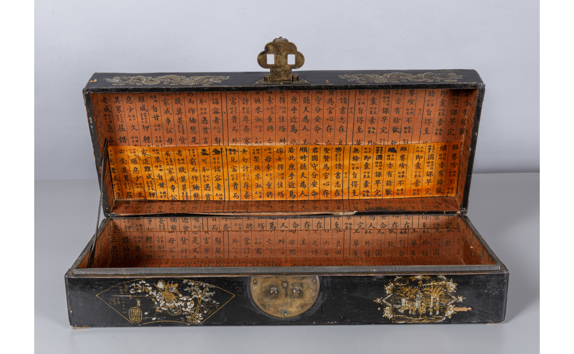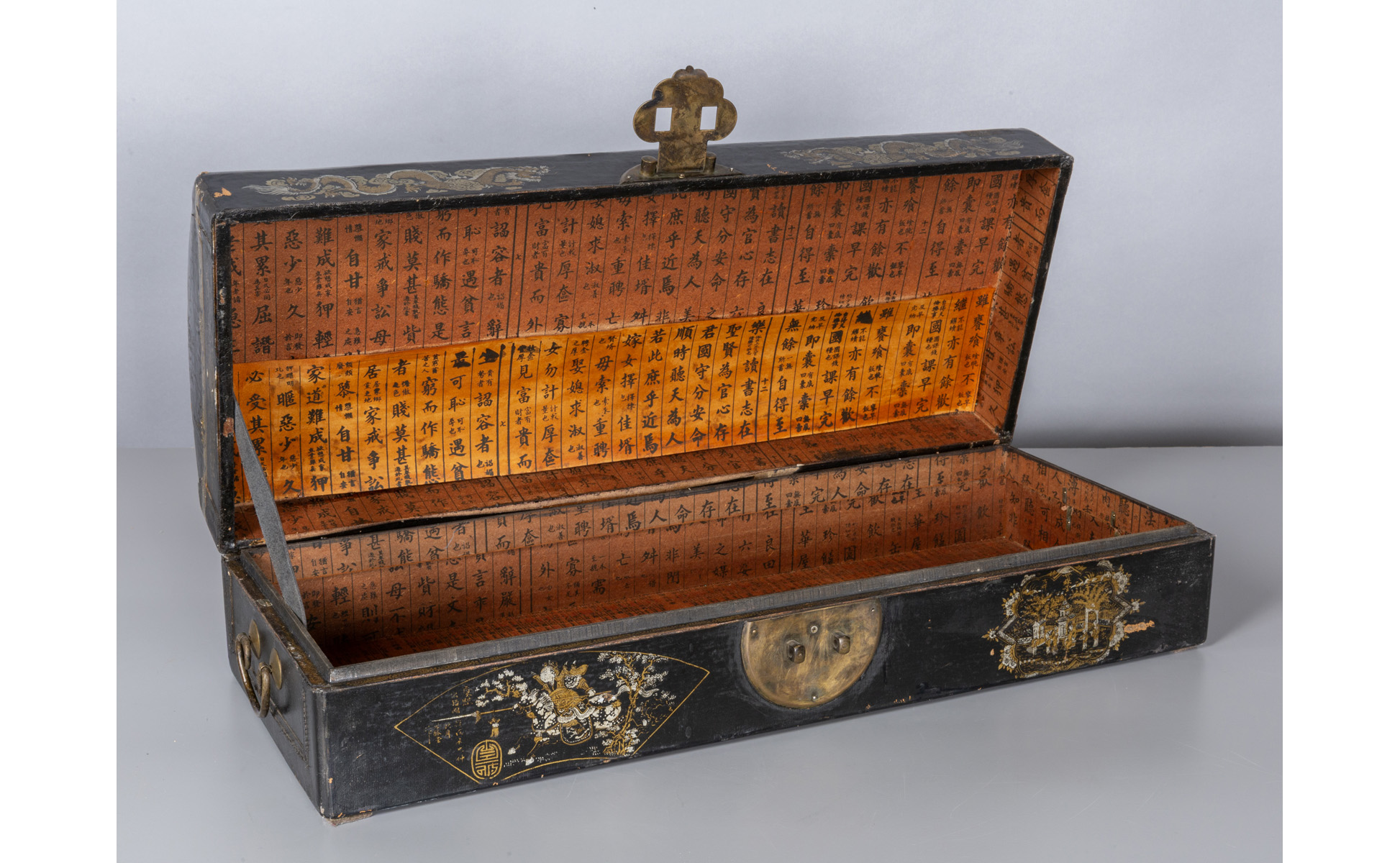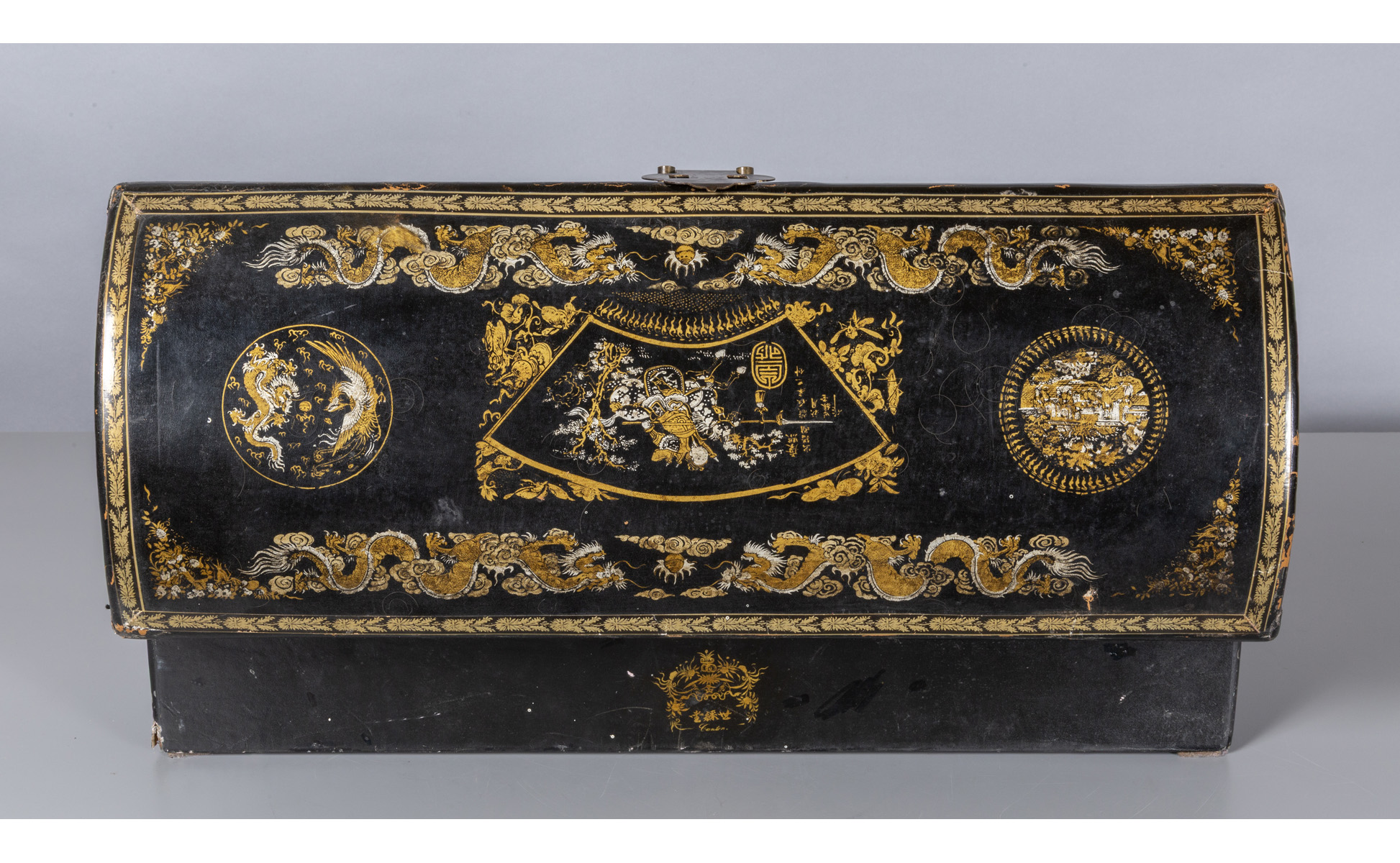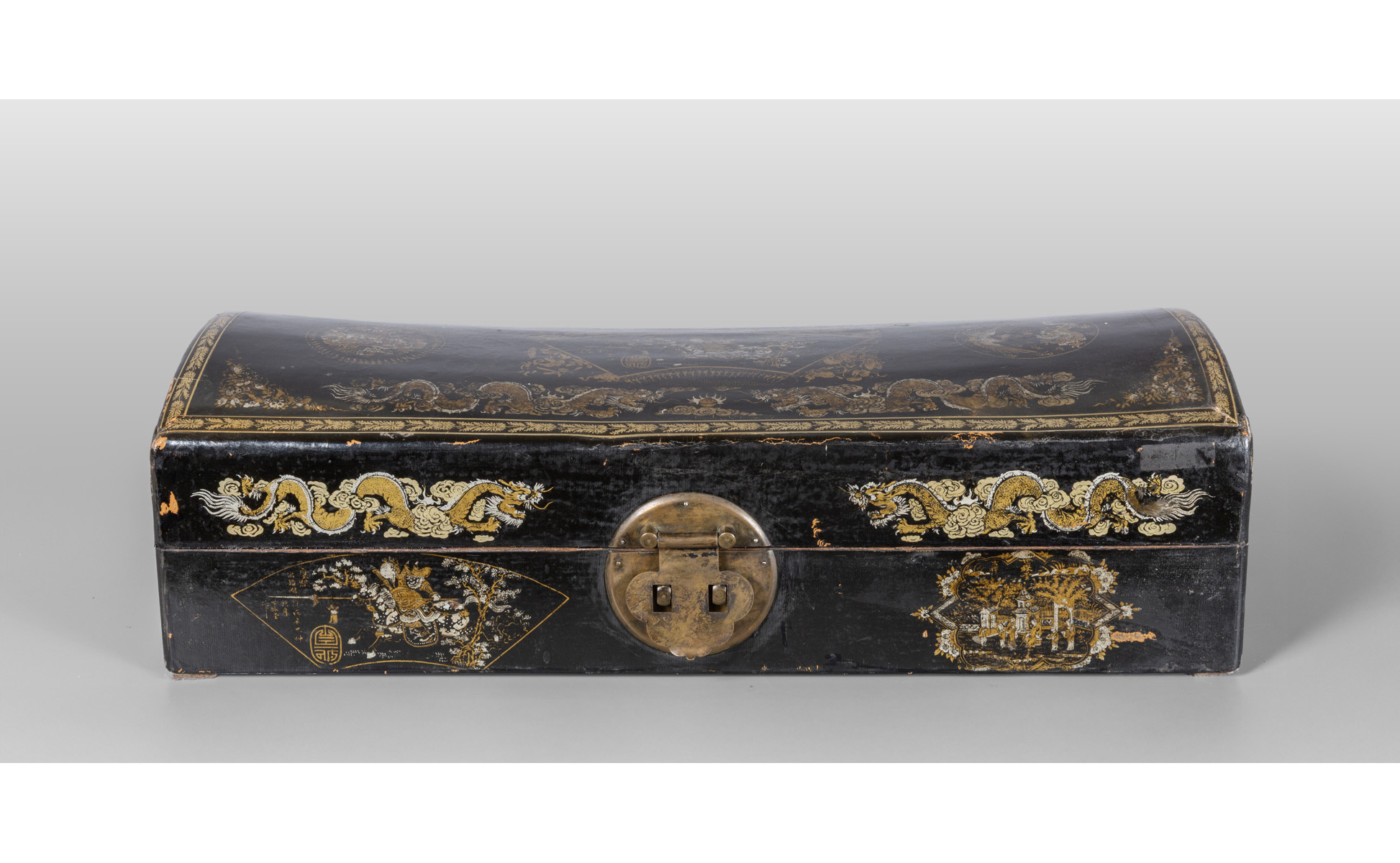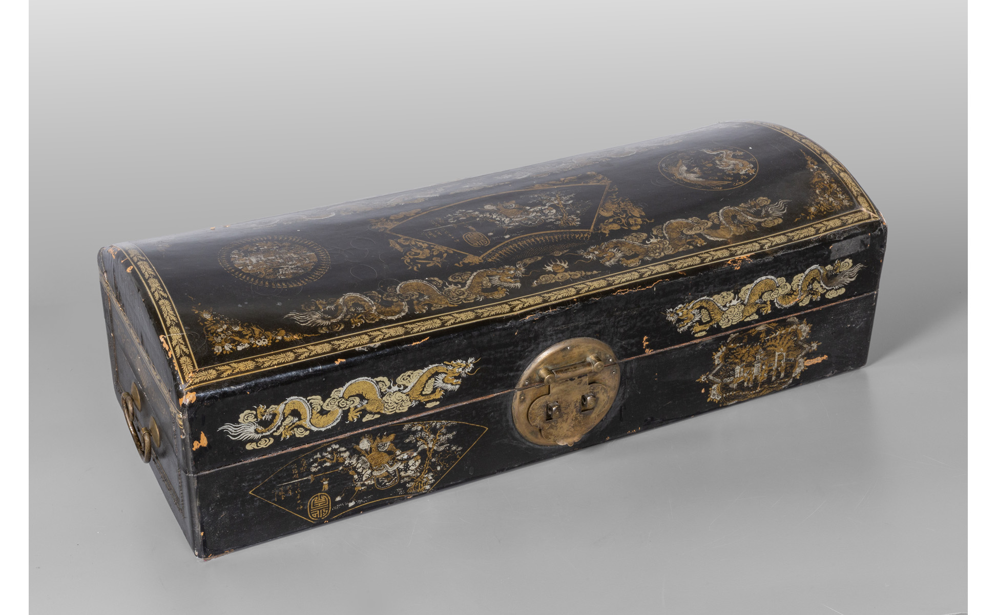 Baule in legno laccato oro e argento su fondo nero a dragoni e ideogrammi Cina sec.XIX