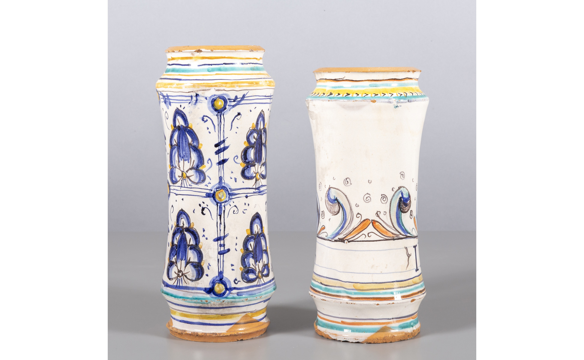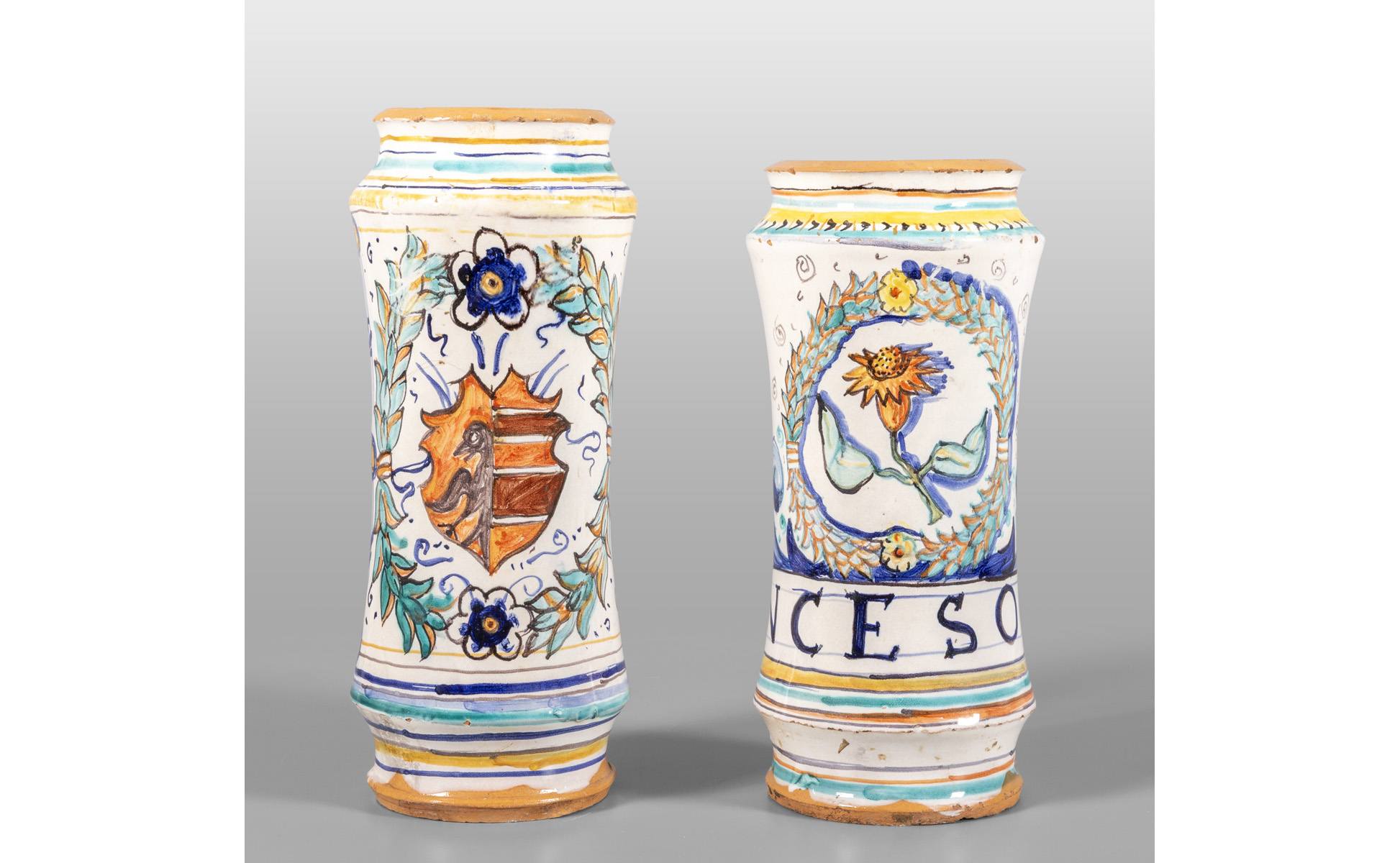Due albarelli in maiolica policroma uno decorato con palmette e ghirlanda con stemma l'altro con scritta 'incenso' Montelupo sec.XIX