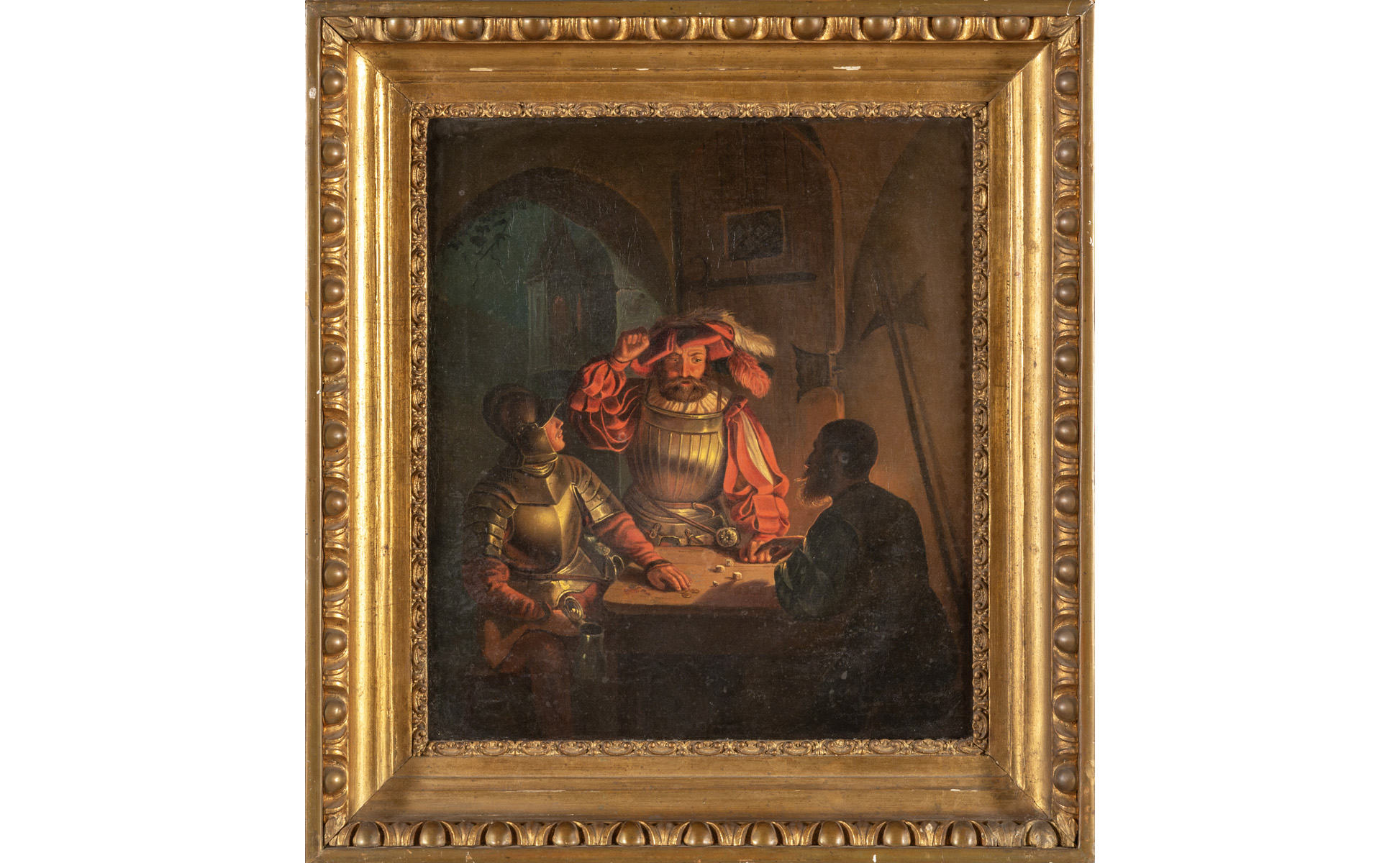Scuola fiamminga sec.XIX 'Giocatori di dadi' olio cornice in legno intagliato e dorato