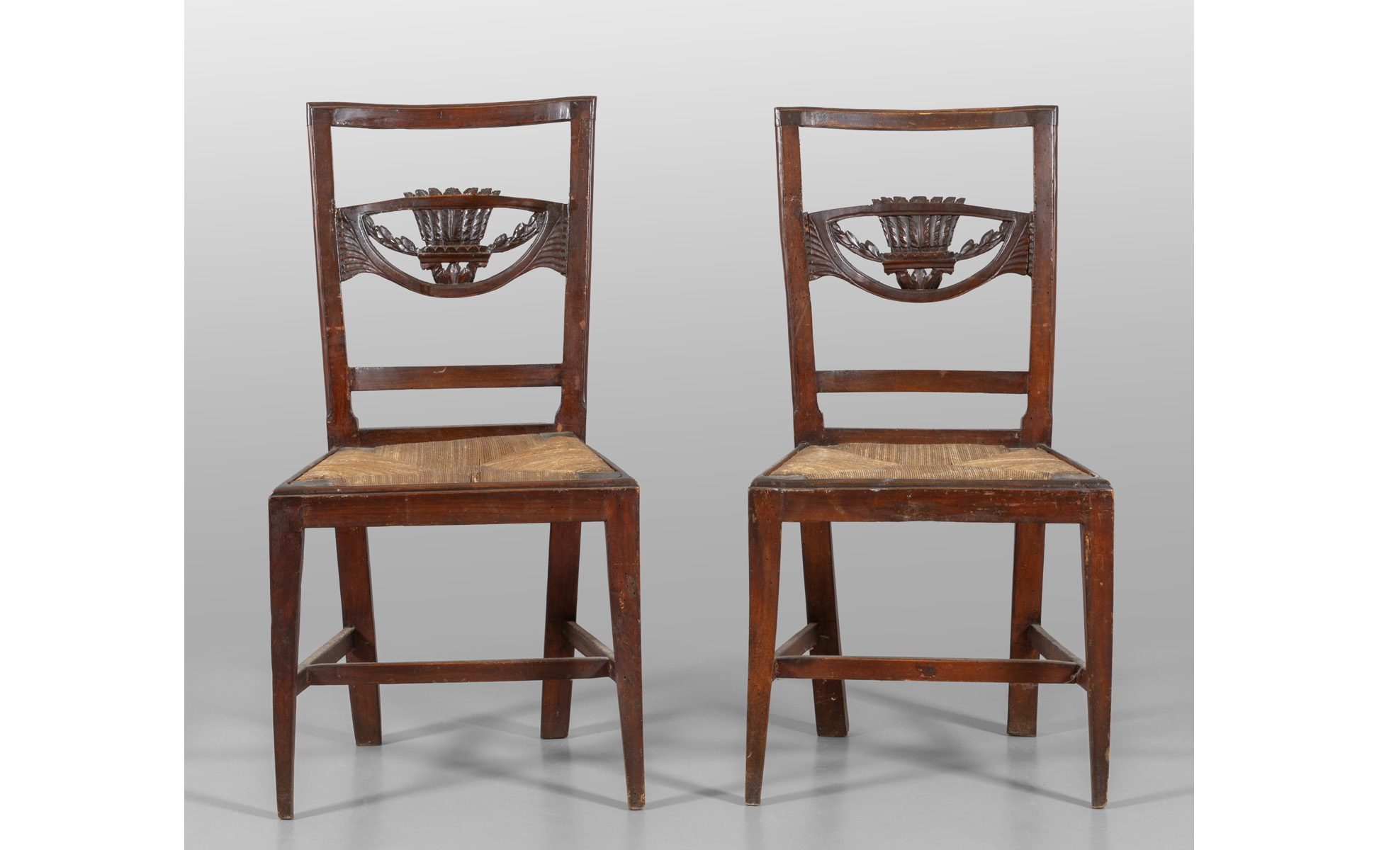 Coppia di sedie Direttorio schienale intagliato a palmetta sec.XIX