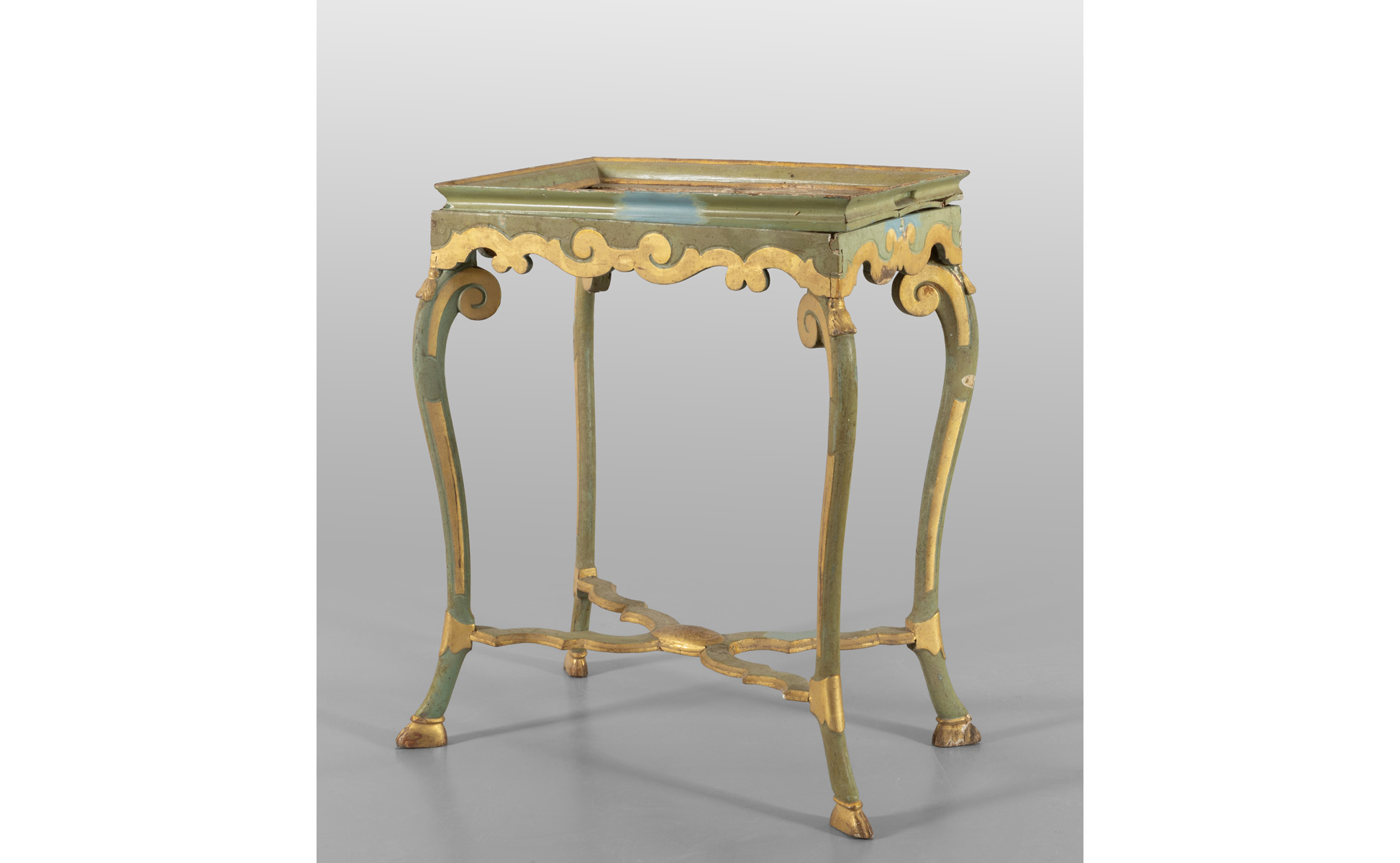 Tavolino in legno intagliato e laccato a fondo verde e oro piano a vassoio sec.XIX
