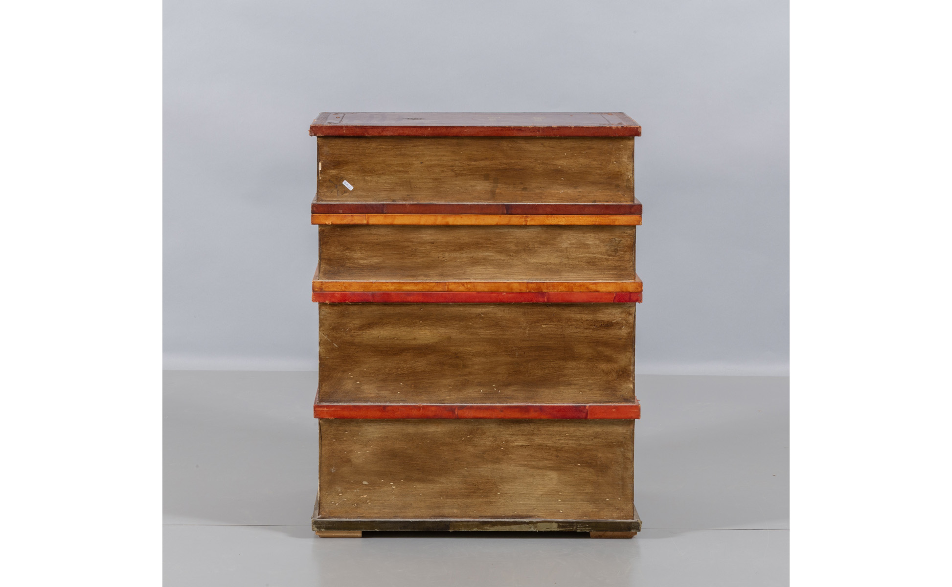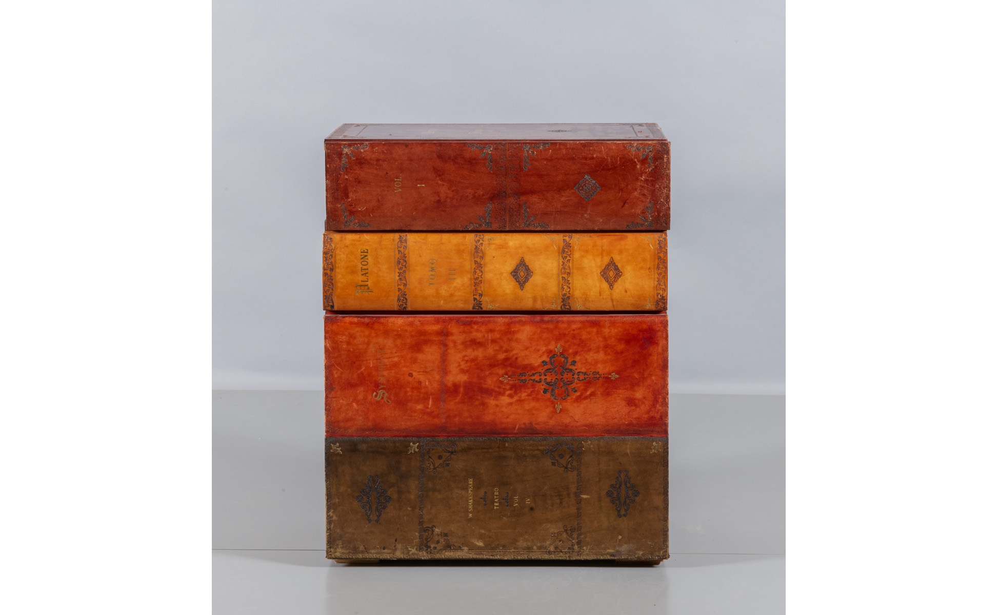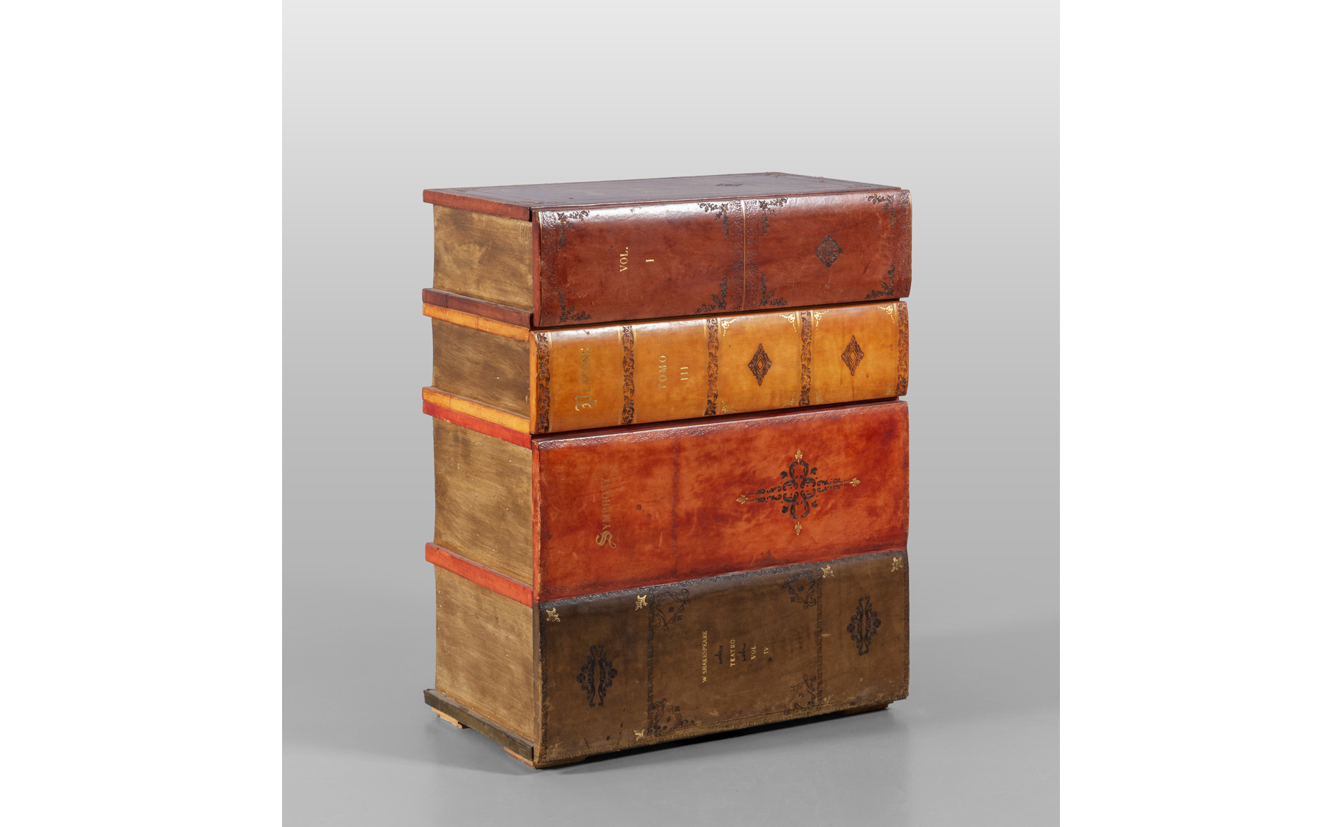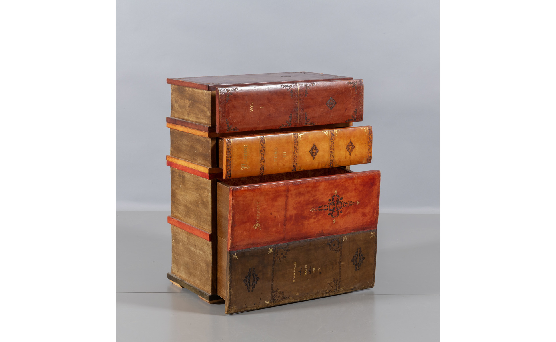 Mobiletto a quattro cassetti decorato con antichi libri rilegati in pelle