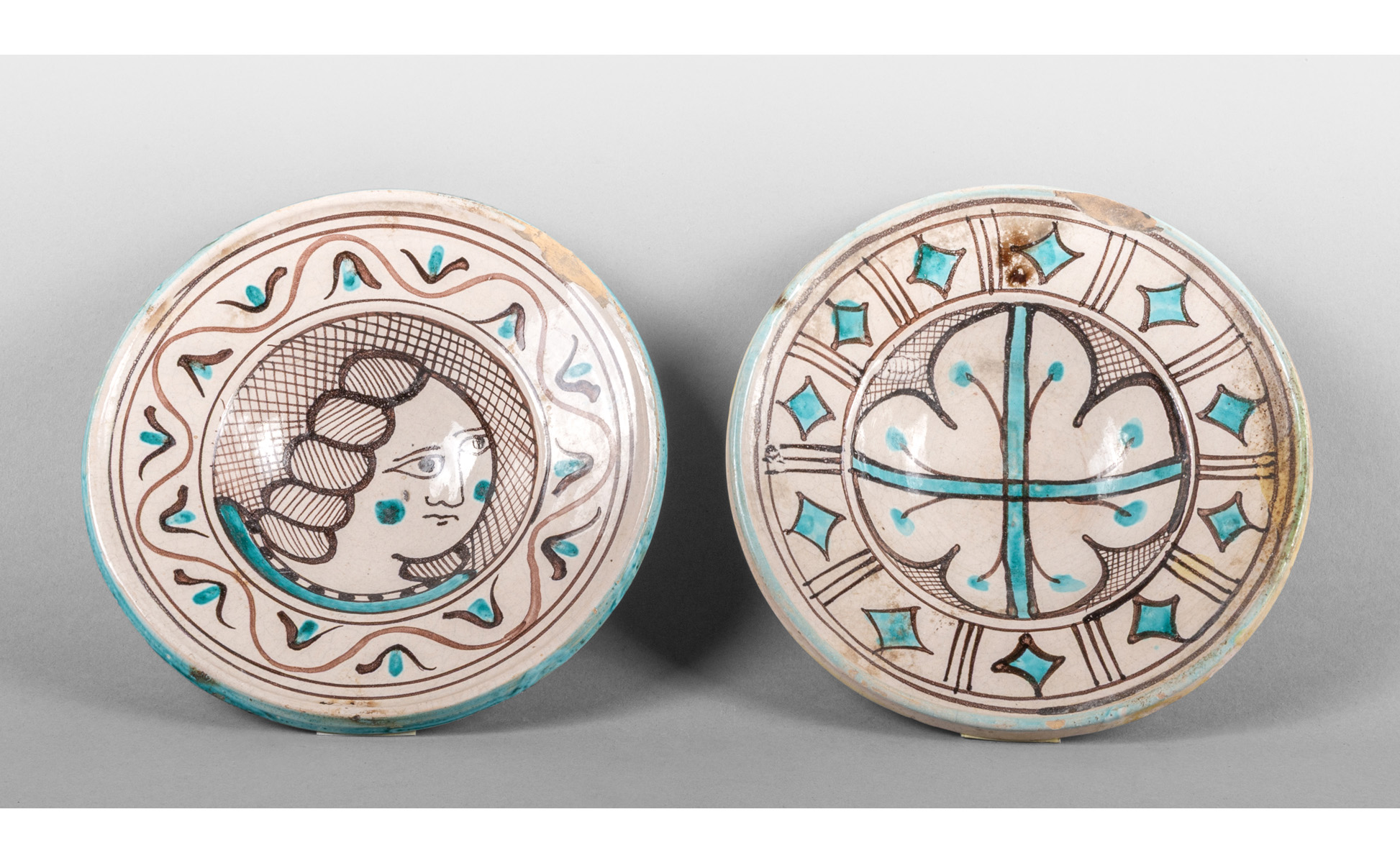 Coppia di piatti in maiolica uno raffigurante un volto femminile l'altro con fiore centrale sec.XIX